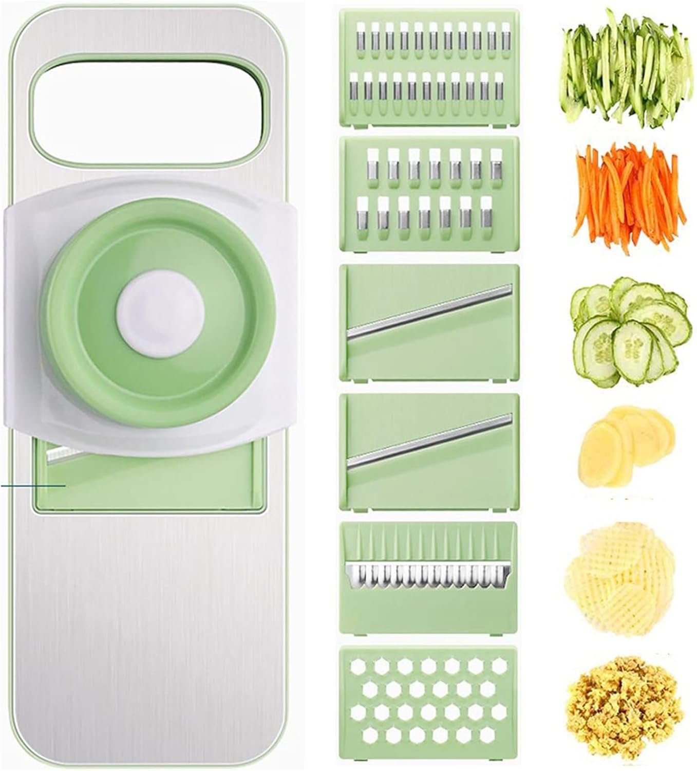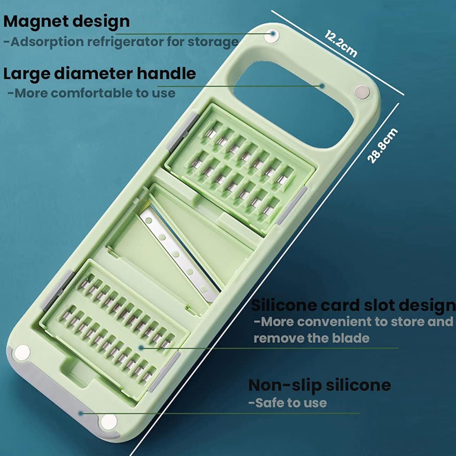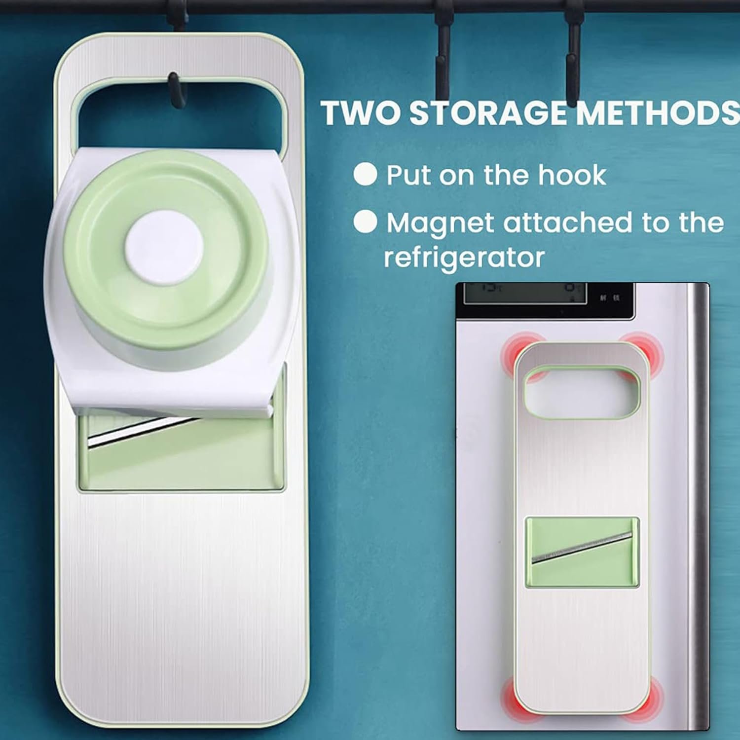 【Convenient Storage Options】Equipped with a magnet on the back, the chopper can be conveniently stored on iron surfaces such as refrigerator doors. Blades can be stored on the back of the cutting board for quick access, while the storage box keeps less frequently used blades neatly organized.