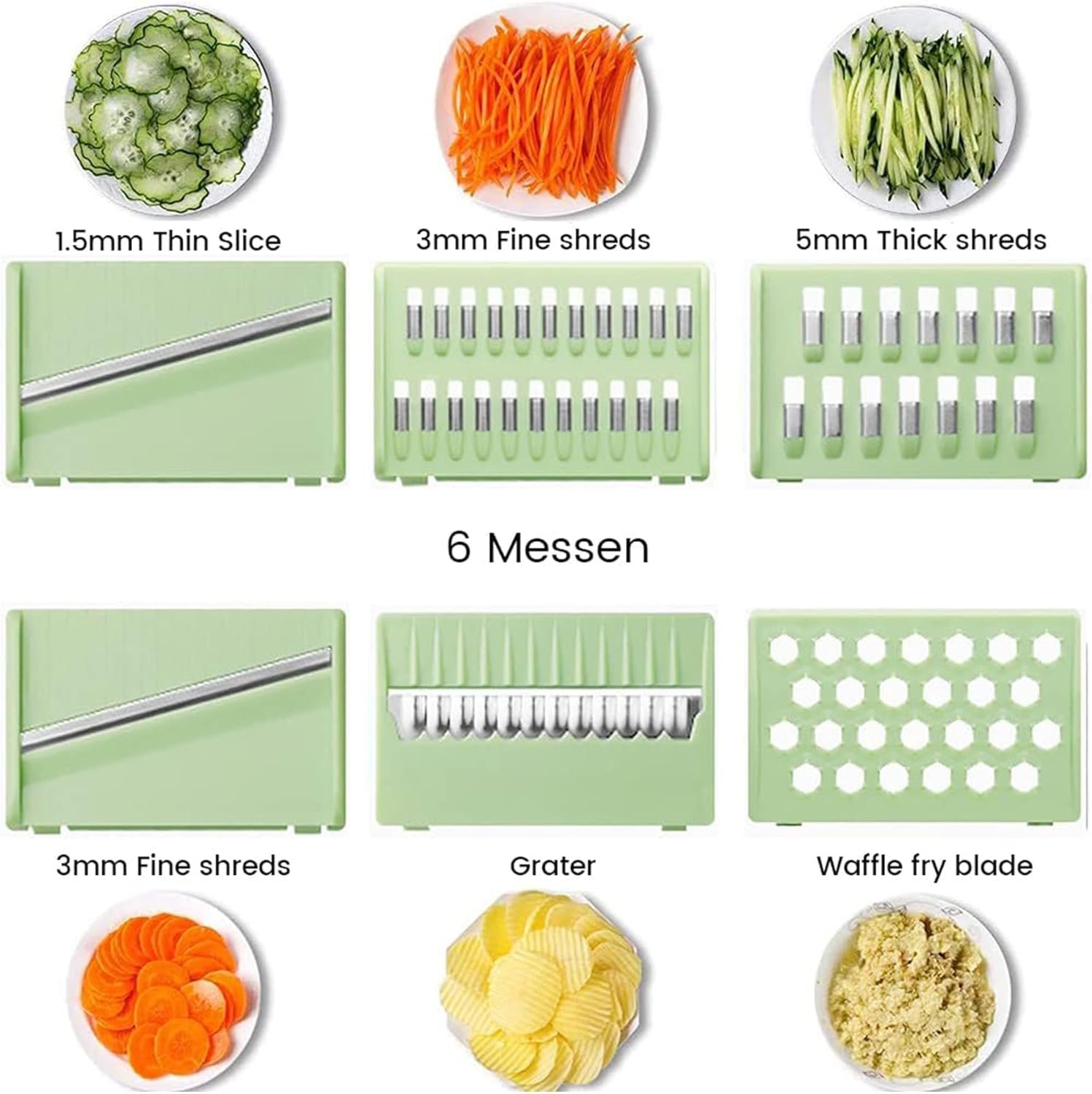 【Safe and User-Friendly Design】Designed with a fully enclosed spring arm guard, the chopper ensures safe usage without risking injury. It handles even small ingredients like lemon slices or potato chips efficiently, minimizing waste. The mandoline food slicer includes a blade storage box for convenient space-saving storage.