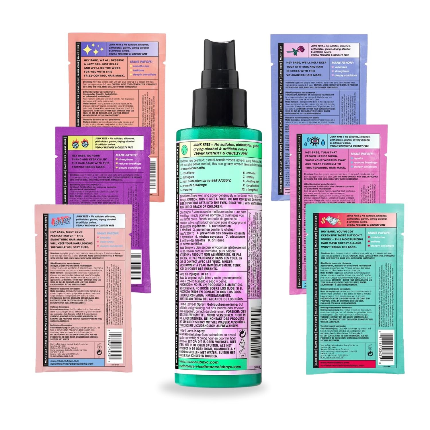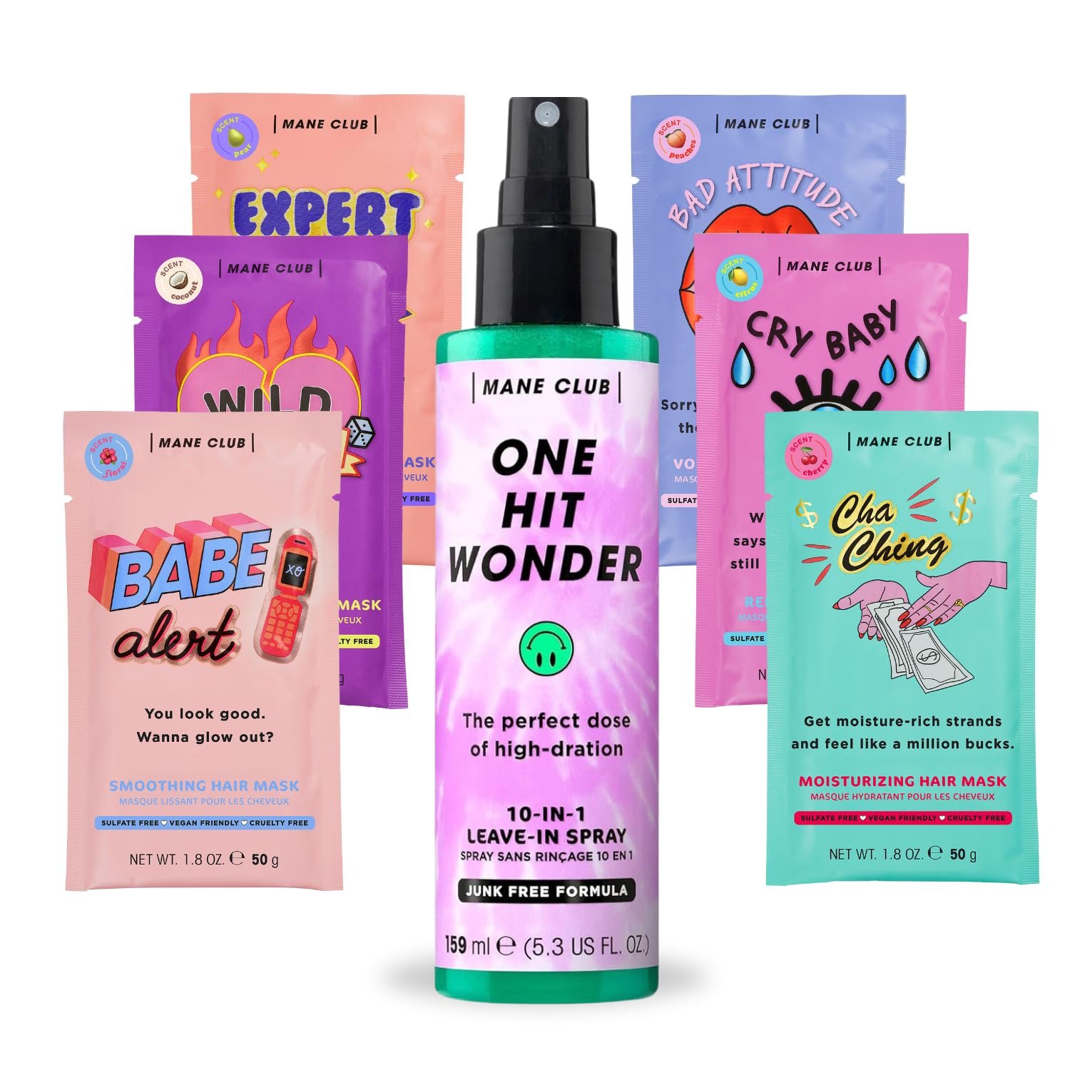 Comprehensive Hair Care Set | Includes a 6-pack of MANE CLUB Variety Pack Deep Conditioning Hair Masks and a 5.3 oz MANE CLUB One Hit Wonder 10-in-1 Leave-In Spray
