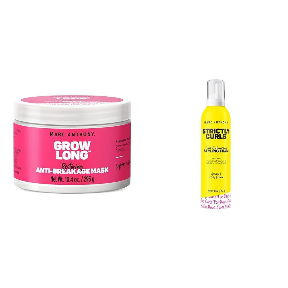 This haircare bundle pairs Marc Anthony’s 10.4 oz Grow Long Restoring Anti-Breakage Mask with the 10 oz Strictly Curls Curl Enhancing Styling Foam. The Anti-Breakage Mask is formulated with Caffeine, Ginseng, and Hydrolyzed Keratin to smooth hair cuticles, promote strength and softness, and reinforce hair from the inside out. It revives elasticity for healthier looking hair. The Curl Foam contains Silk Amino Acids and Vitamin E to give curls a fuller finish with extra hold, maximum shine boost, and frizz removal. Its moisturizing ingredients like Shea Butter help detangle and tame unruly curls. Together, these complementary products provide solutions for different hair needs – the mask restores and strengthens all hair types, while the foam boosts, defines, and controls curly hair. Both are sulfate-free and made with Marc Anthony’s signature high-quality ingredients for affordable, easy-to-use haircare.