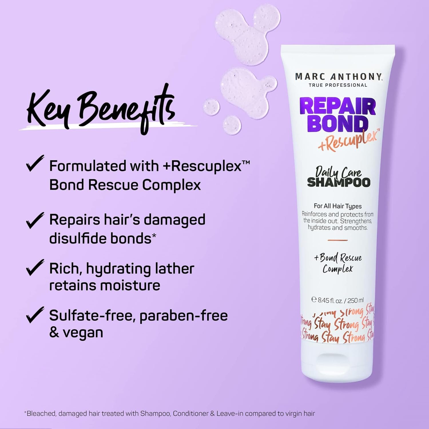 Repair Bond +Rescuplex Shampoo: Hair fiber is made up of bonds that give it strength, which can be damaged by things like hair color, daily styling, and pollution. This Shampoo is the first step in the Marc Anthony Repair Bond +Rescuplex system. Its rich lather deeply cleanses and removes buildup while leaving your hair softer, smoother, and feeling hydrated. For best results, use with the full Repair Bond +Rescuplex system of Shampoo, Conditioner, Leave-In Treatment and Mask. 8.45 fl oz.
