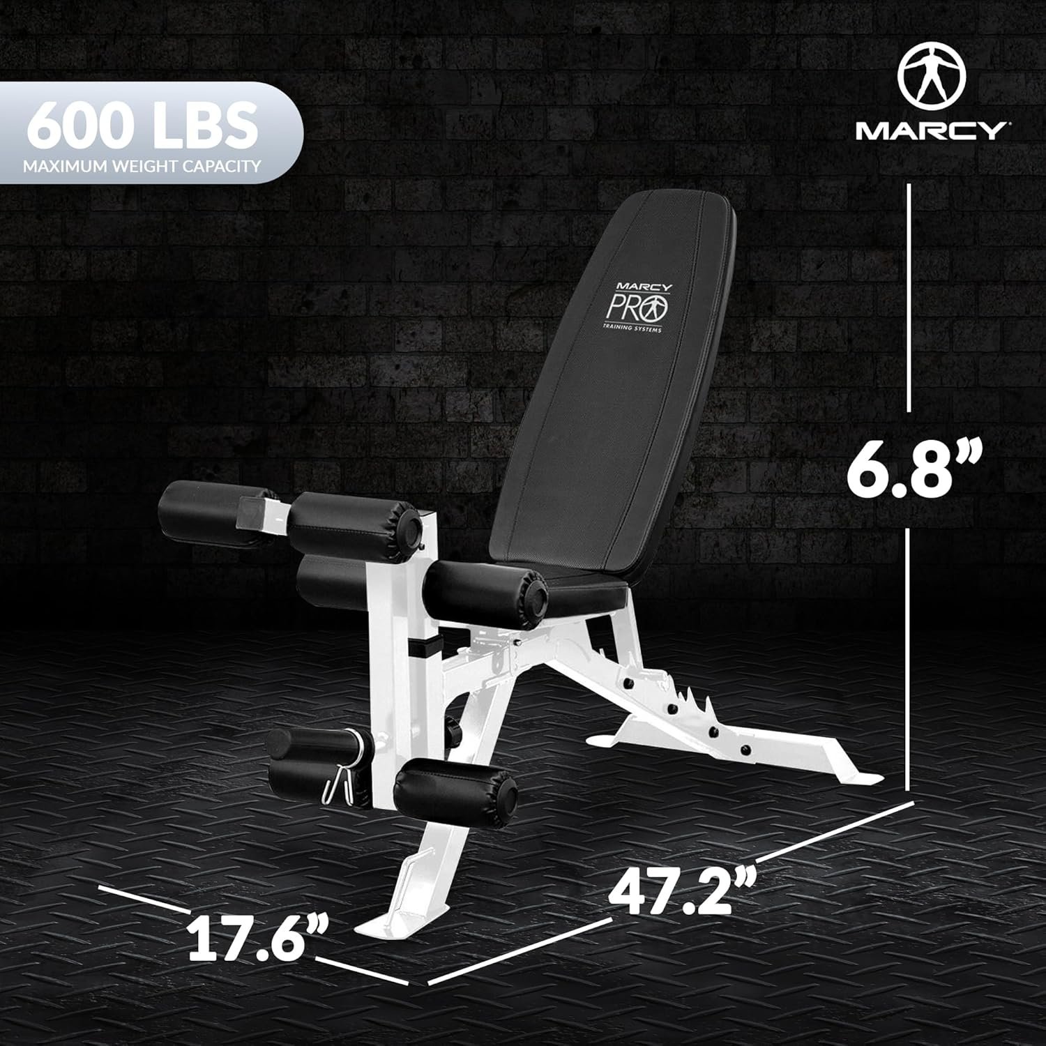 Weight Capacity and Dimensions: Supports a max weight capacity of up to 600 lbs, offering dimensions of 47.2″ L x 17.6″ W x 6.8″ H, with added leg extension for lower body workouts