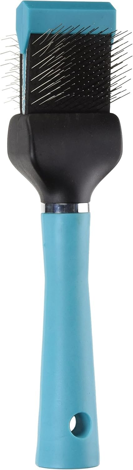 Our exclusive Master Grooming Tools flexible slicker brush give you the flexibility you need to deliver superior grooming results without sacrificing your hands and wrists in the process. Flexible handles produce less stress on your hands and wrists than traditional fixed slicker brushes. Flexible brushes conform to the contour of the animal. Available in a single brush and with hard handle. The smaller, single-sided brushes are ideal for smaller pets. Hard brush style is designed for tough mats. Available in teal color. Measures 8-inch length by 1-3/4-inch width.