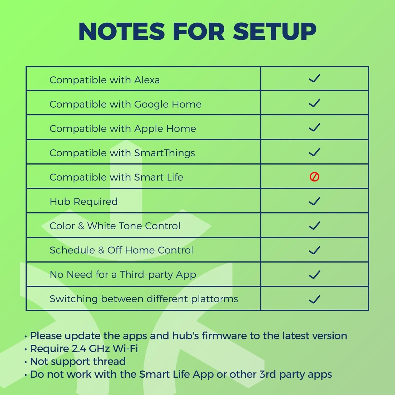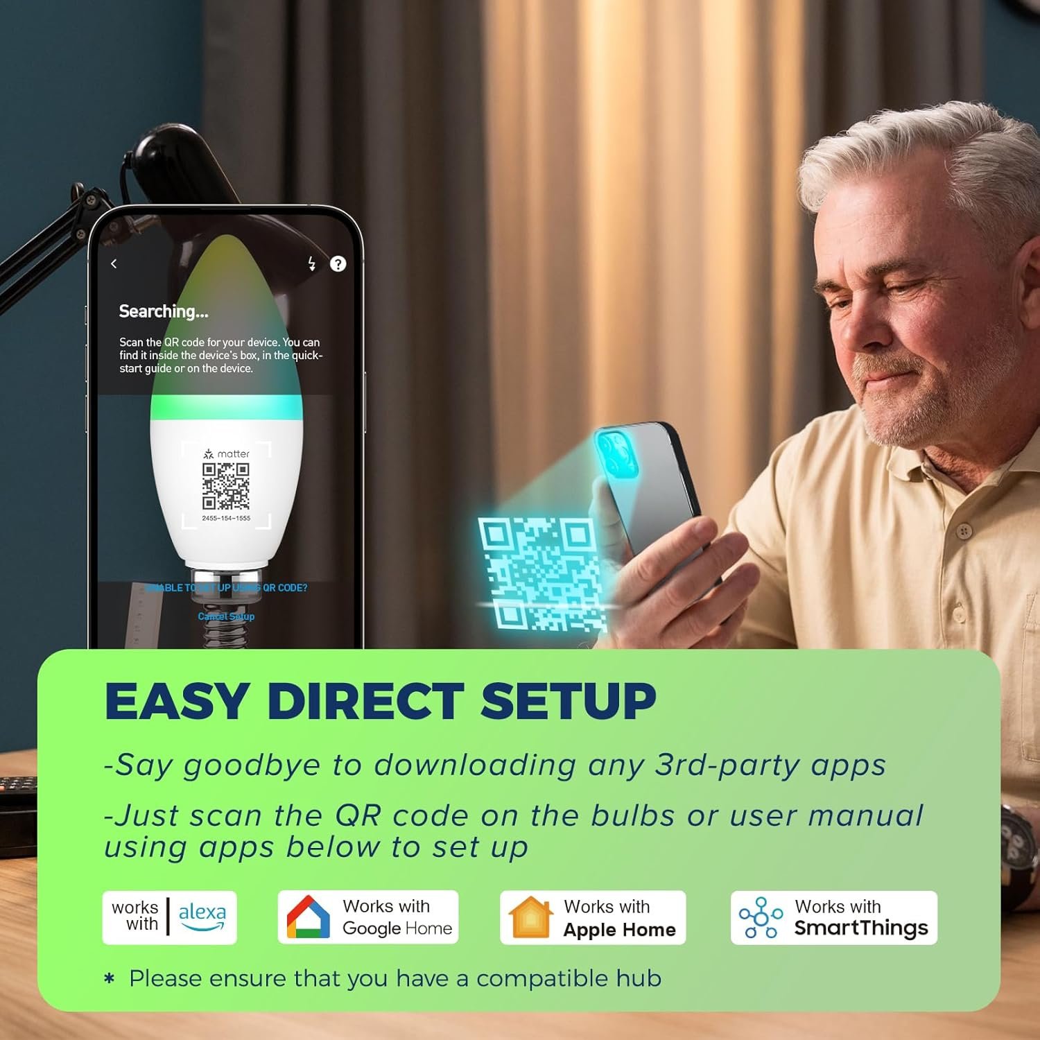 Matter Compatible: The Matter-certified E12 smart bulbs are compatible with Apple Home, Alexa, Google Home, and SmartThings platforms directly, eliminating the hassle of downloading a third-party app. For initial setup, a compatible hub like Echo is required. Once configured, effortlessly control your Matter smart light bulbs using voice commands