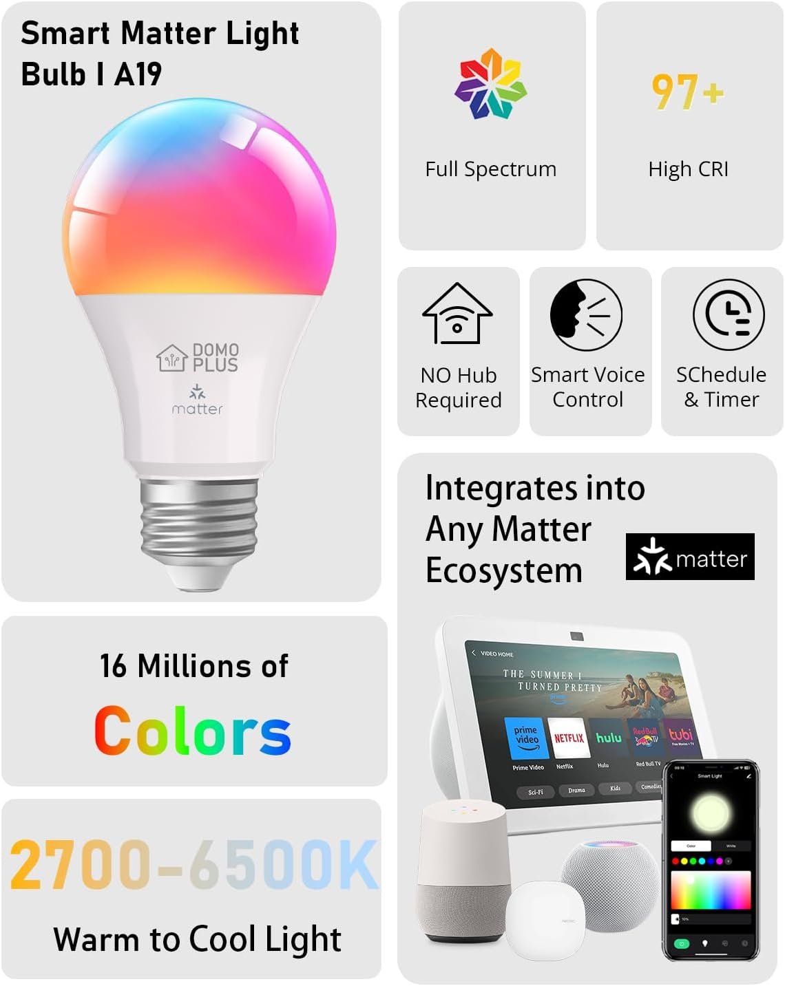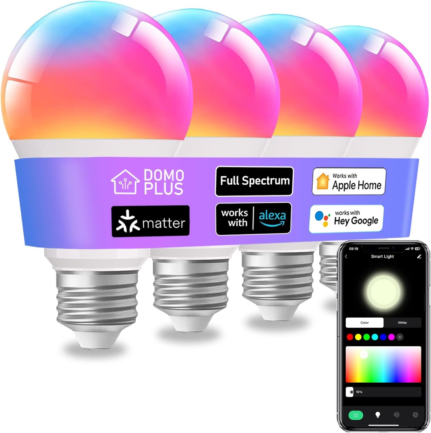 Full Spectrum Lighting: Experience the benefits of natural sunlight with our DOMOPLUS full spectrum smart light bulb. It mimics the sun’s natural light spectrum, promoting better sleep, increased energy levels, and improved mood.