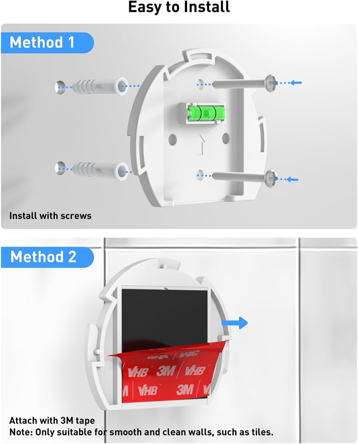 Two Ways to Install : You can install the mount on smooth and clean walls by easily attaching it with the 3M tape. Or a more permanent way is install the mount by screws for dry walls or wooden frame, cabinet