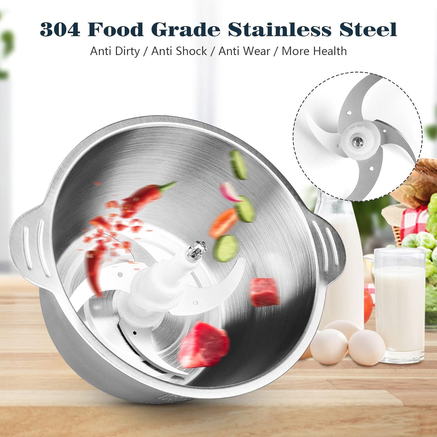 Safe And Large Capacity – The food processor is equipped with a 2L capacity stainless steel bowl which is made of food grade 304 stainless steel. It is stronger, healthier and shock-proof, ensuring durability.