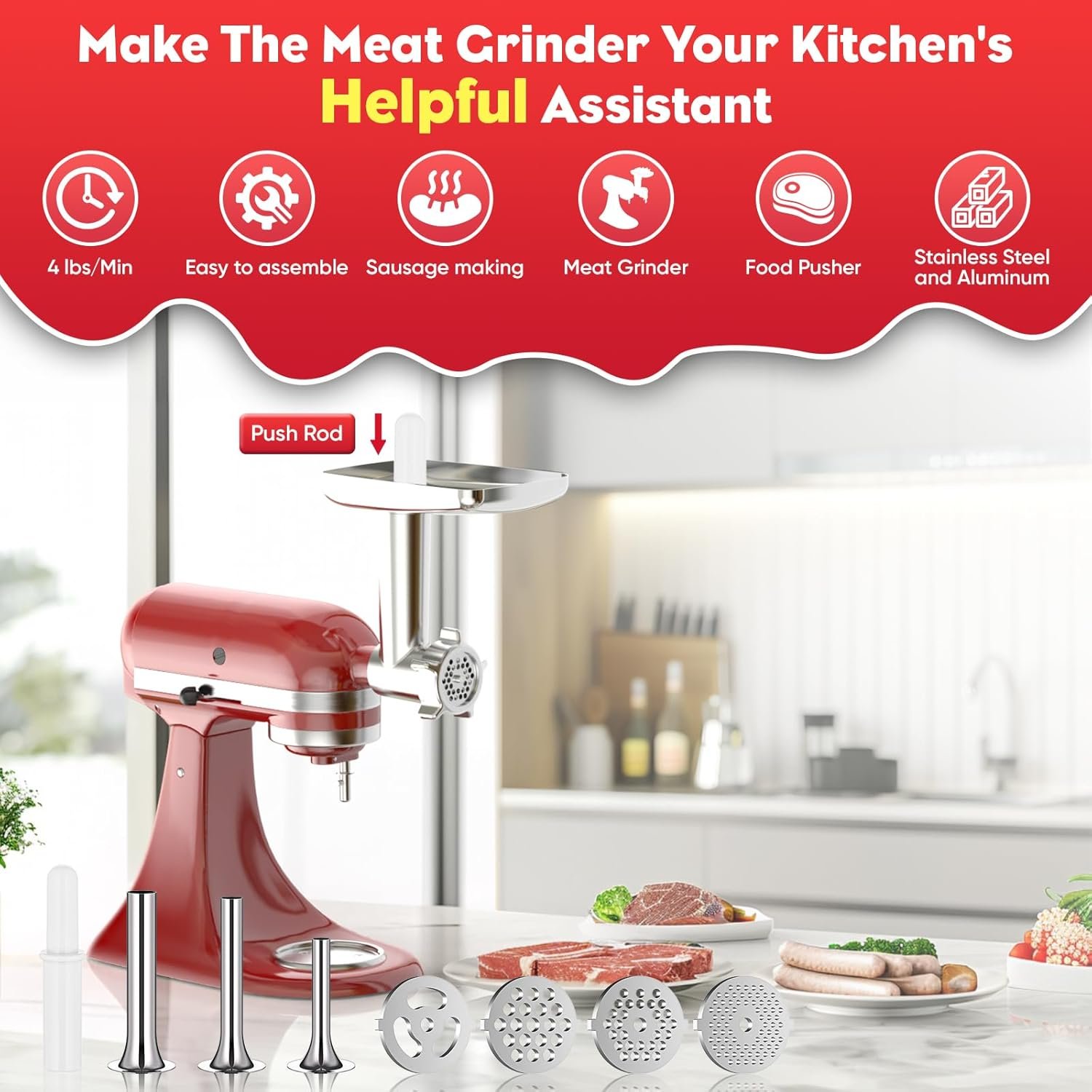 Multifunctional Applicatio: Sausage stuffer for Kitchenaid mixer attachments comes with several useful attachments, including 4 stainless steel grinder trays, 3 sausage stuffing tubes, 2 grinder blades, 1 sausage stuffing rack, 1 removable food tray, 1 food pusher and cleaning brush. These kitchenaid mixer attachments provide more options and combinations for your cooking experience, from grinding meat and meatballs, meat sauces, making sausages to a variety of other cooking needs