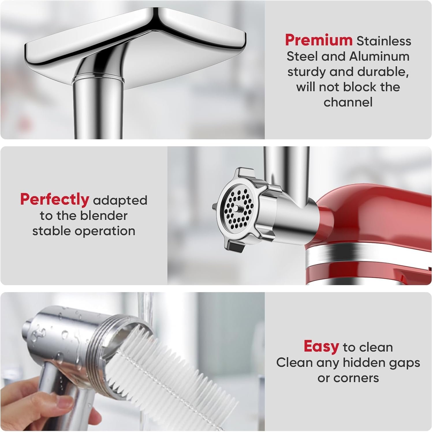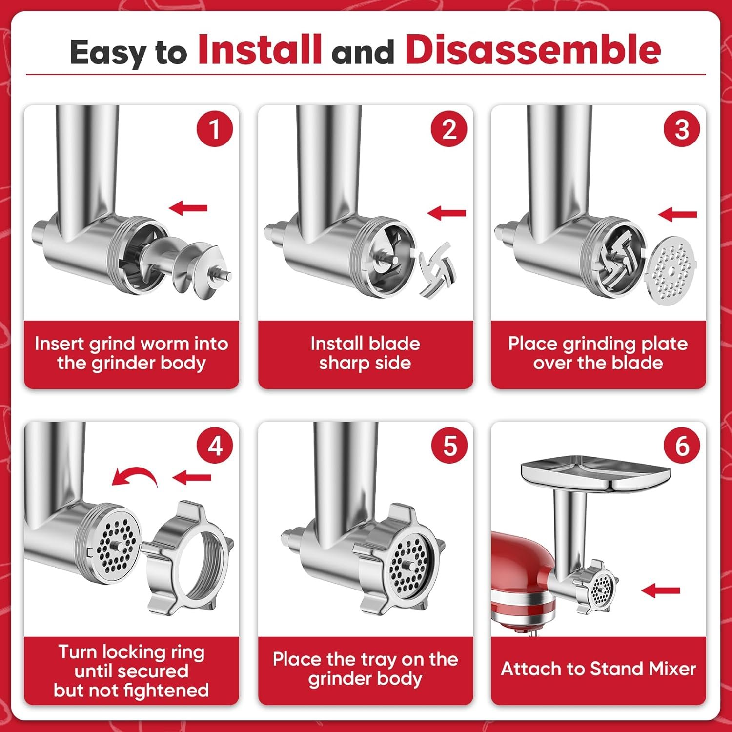 Easy to Clean: All parts of the meat grinder for Kitchenaid can be easily disassembled, and the included cleaning brush allows you to clean every corner easily. The kitchenaid mixer attachments removable design is more convenient for thorough cleaning, keeping kitchen and meat grinder clean and hygienic.Dishwasher safe is not supported, hand washing with soap and warm water (not exceeding 122 °F) is recommended