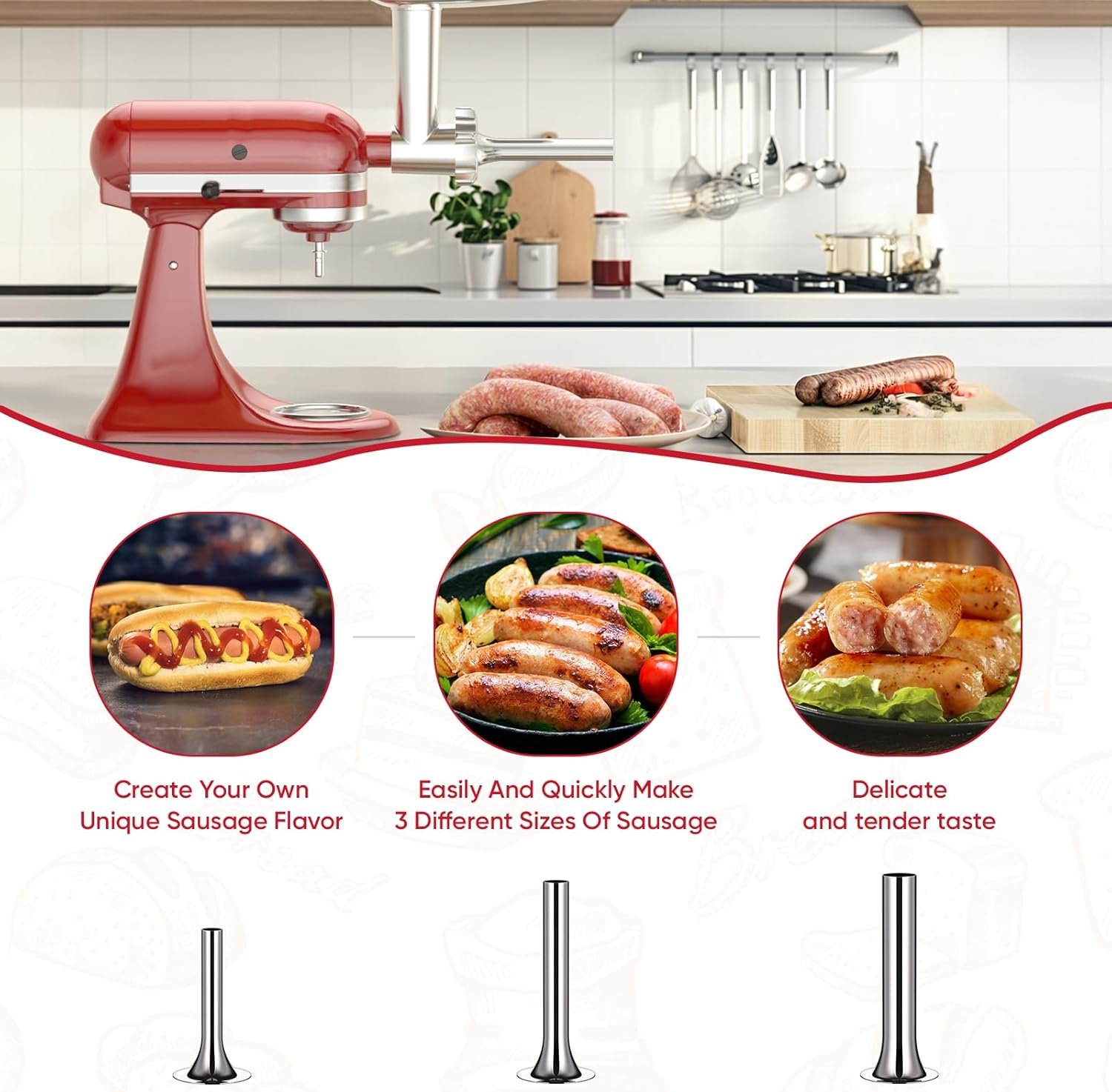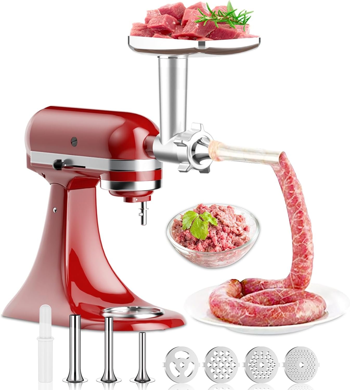 Making Delicious Sausages: Meat grinder for Kitchenaid Mixer can not only be used to grind meat, but can also be used as a sausage stuffer attachment. The kitchenaid mixers accessories is equipped with three different sizes of sausage stuffing tubes (0.47 inch, 0.75 inch, 1.25 inch), which can quickly and easily produce various flavors of sausage, such as bacon sausage, Italian sausage, summer sausage, let’s make healthy and delicious sausages for family