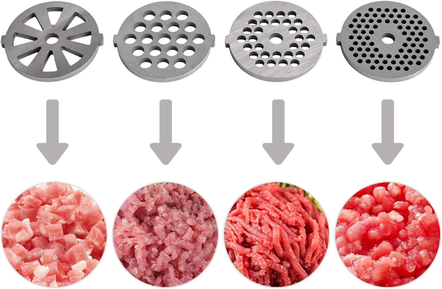 ×Powerful Accessories: The 3/5/7mm grinding plates, fan-shaped grinding plate, sausage stuffer, and Kubbe kit help grind meat into different sizes and shapes according to your needs, so you can make more delicious food such as sausages and fried spring rolls.