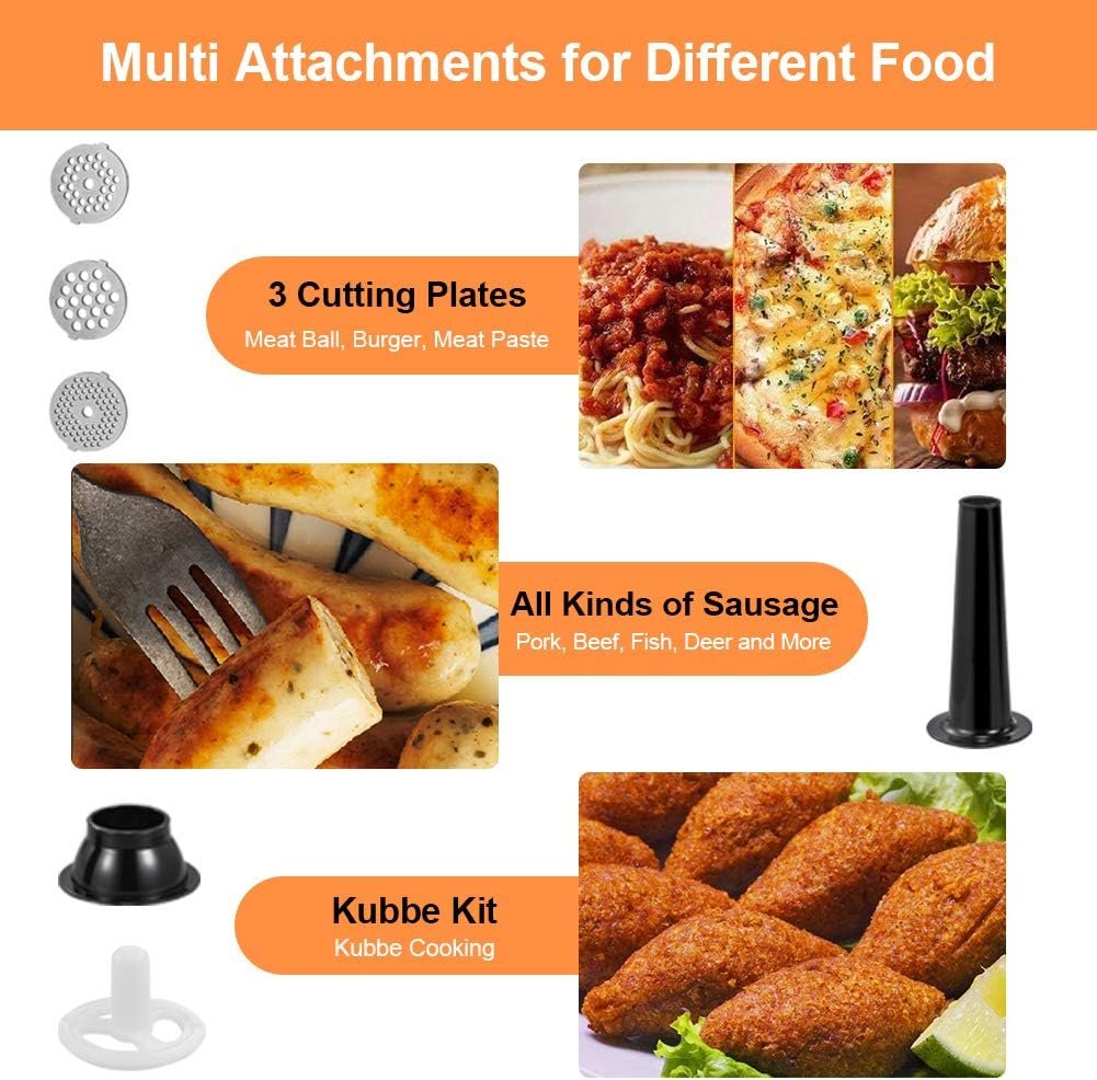 Package Included 1* Electric meat grinder 3* Grinding plates(1*Coarse 1*Medium 1*Fine) 1* set of 3 kubbe and sausage attachments 1* Blade 1* Food pusher 1* User Manual