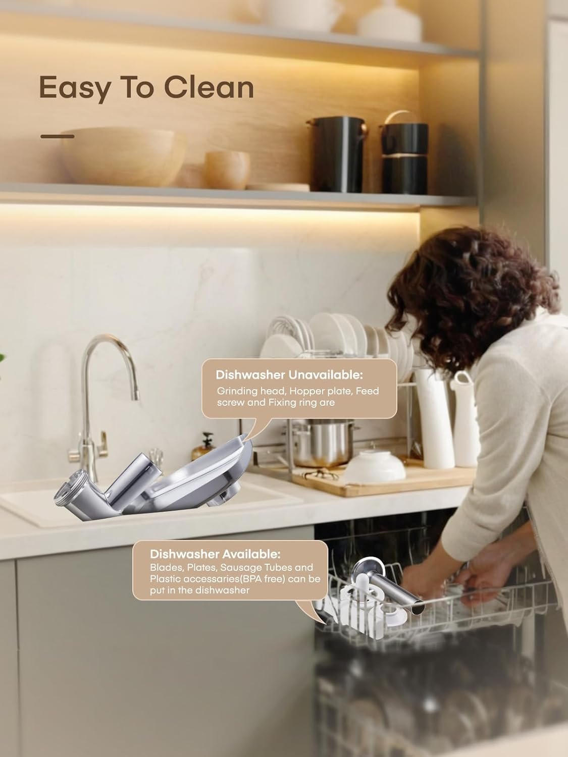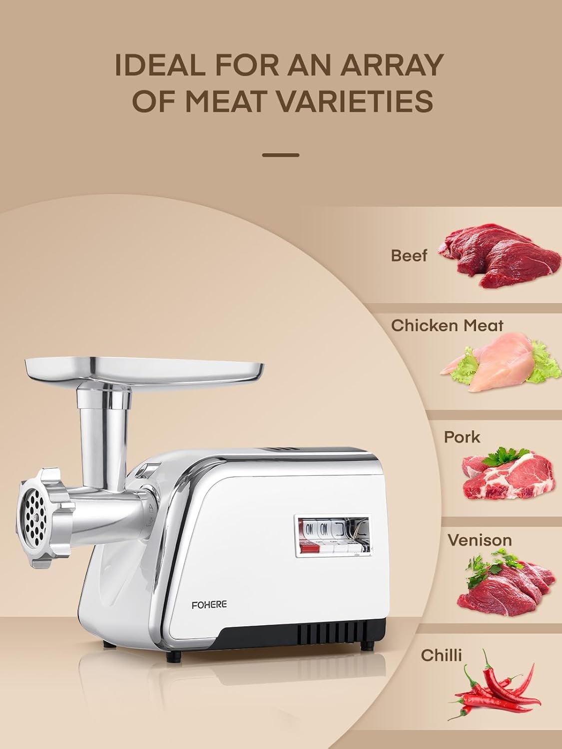 【5 in 1 Multifunctional】 This electric meat grinder comes with 3 stainless steel grinding plates (Fine, Medium, Coarse), 2 sausage tubes (0.7in, 0.9in), Kubbe, meat claws, and a burger press attachment. It can quickly meet most of your needs.