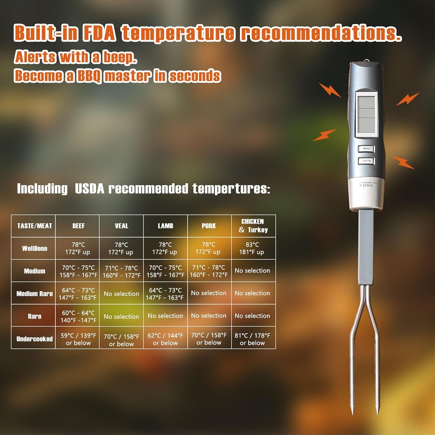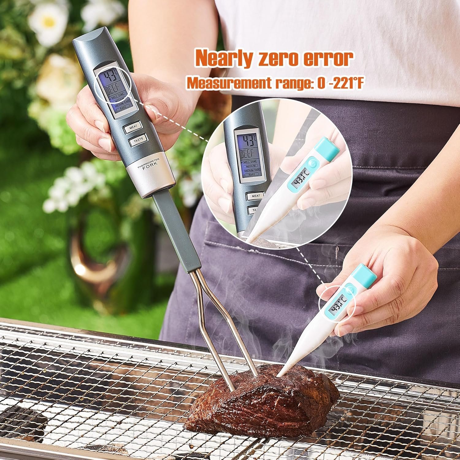 [Say No to Undercooked or Overcooked Food]Tailor your cooking with this BBQ Fork Thermometer, a versatile kitchen gadget that doubles as a steak thermometer and a food thermometer. It offers five meat type selections and allows for precise temperature measurement, ensuring your meat is cooked just the way you like it.