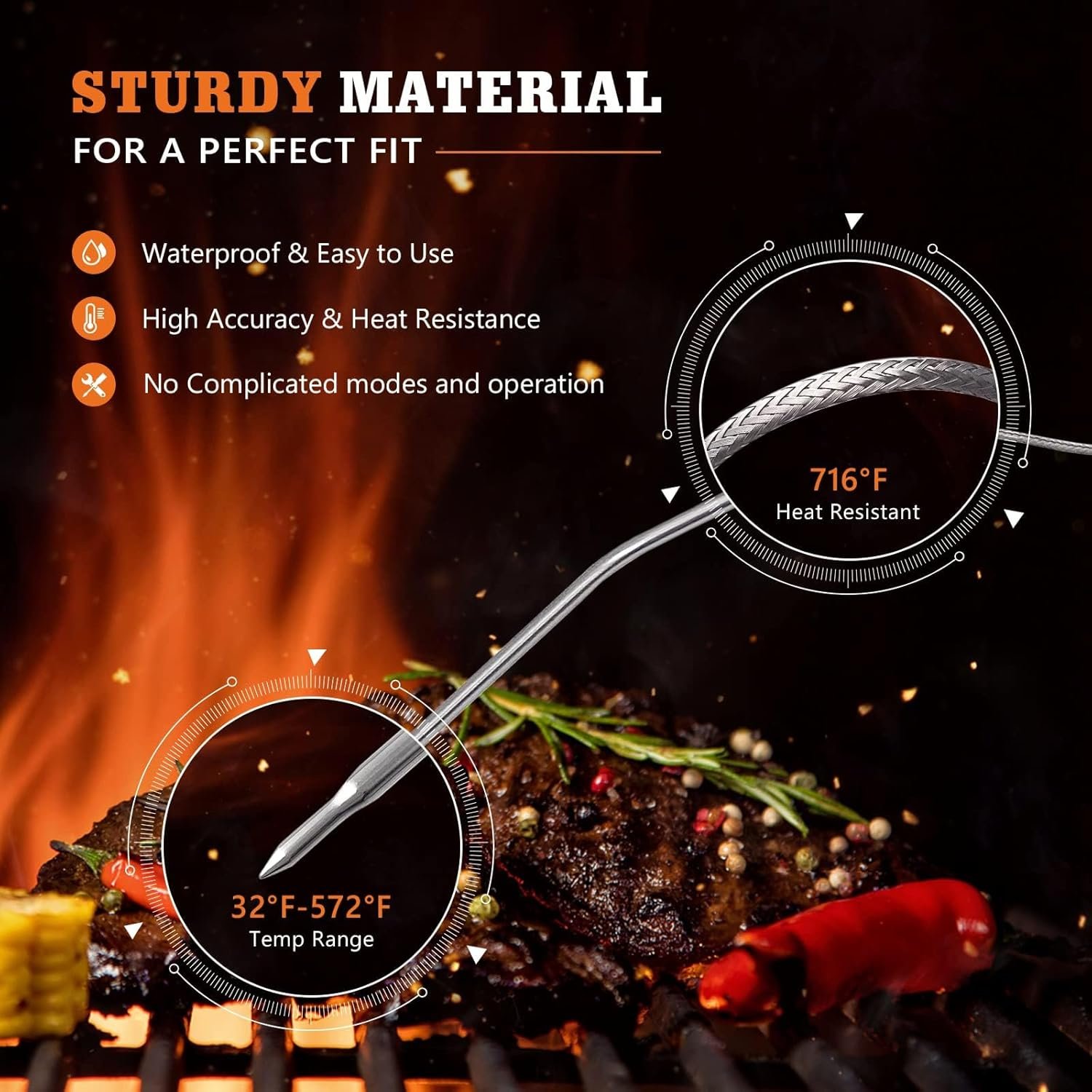 STEP-DOWN TIP DESIGN: More accurate test temperature, 2.5 mm plug for use with all meats, The temperature probe will help you monitor the temperature of your food. Temperature detection range: 32 °F to 572 °F (0 °C to 300 °C)