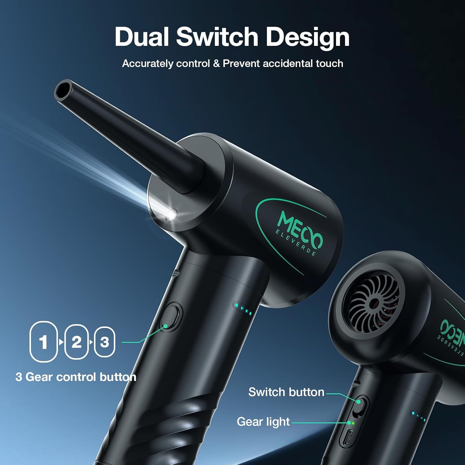 Effortless control & Button upgrade: the dust blower is designed with separate switches and speed control buttons. Changing gears via the shift button provides precise control and eliminates the risk of accidental activation or shifting during use