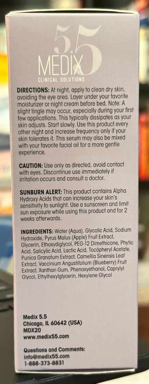 Medix 5.5 Glycolic Acid Serum reduces the appearance of Clogged Pores, Rough Skin Texture, Uneven Skin tone, Redness, and Dark Spots.