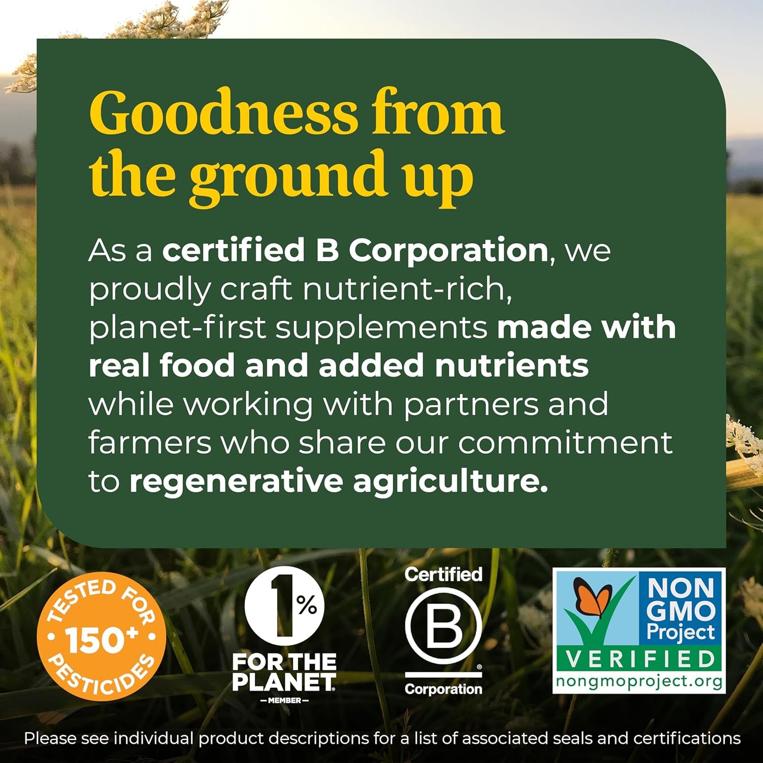 MegaFood is a proud B Corporation, meeting the high standards of overall social and environmental performance, transparency, and accountability. In 2024, we became a member of 1% for the Planet and committed to donating 1% of our annual sales to environmental causes, including The National Young Farmers Coalition and Women’s Earth Alliance.