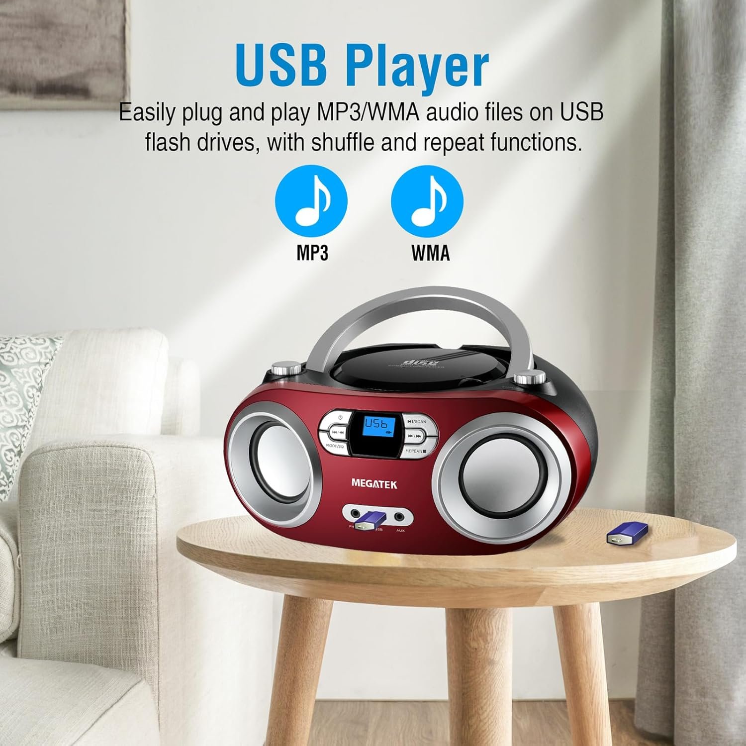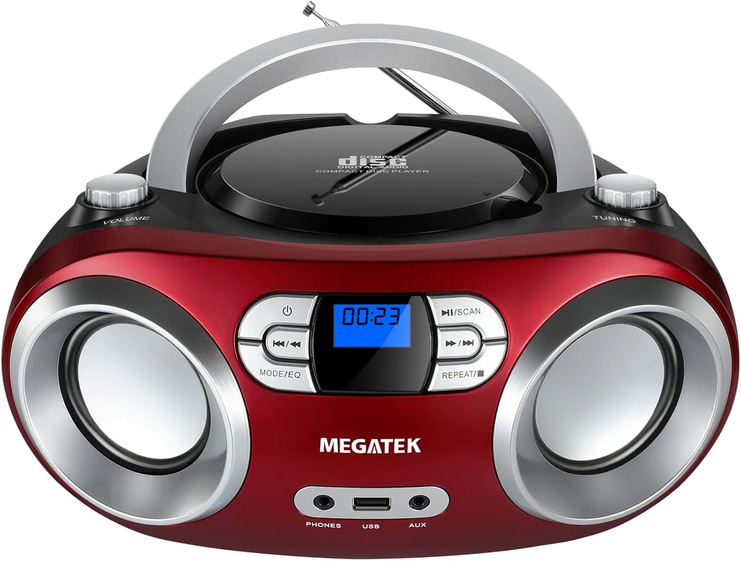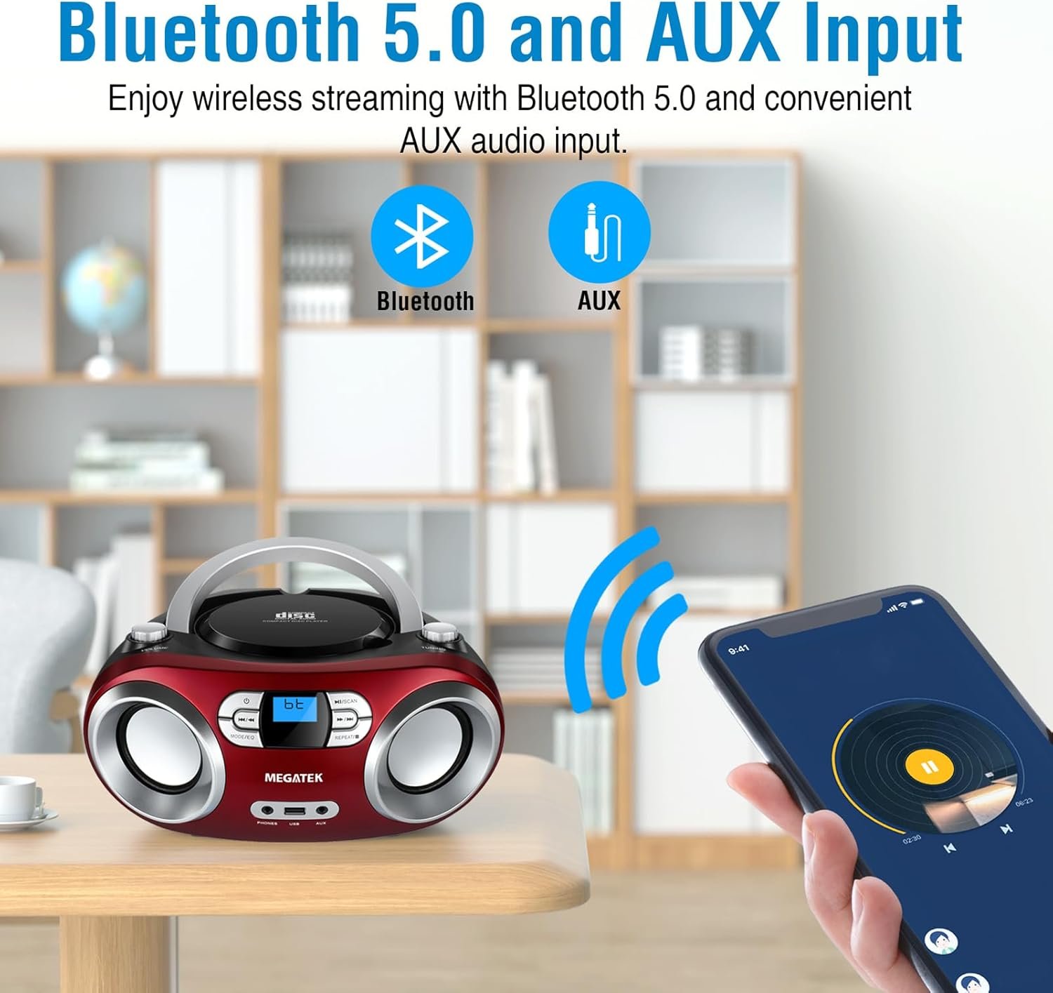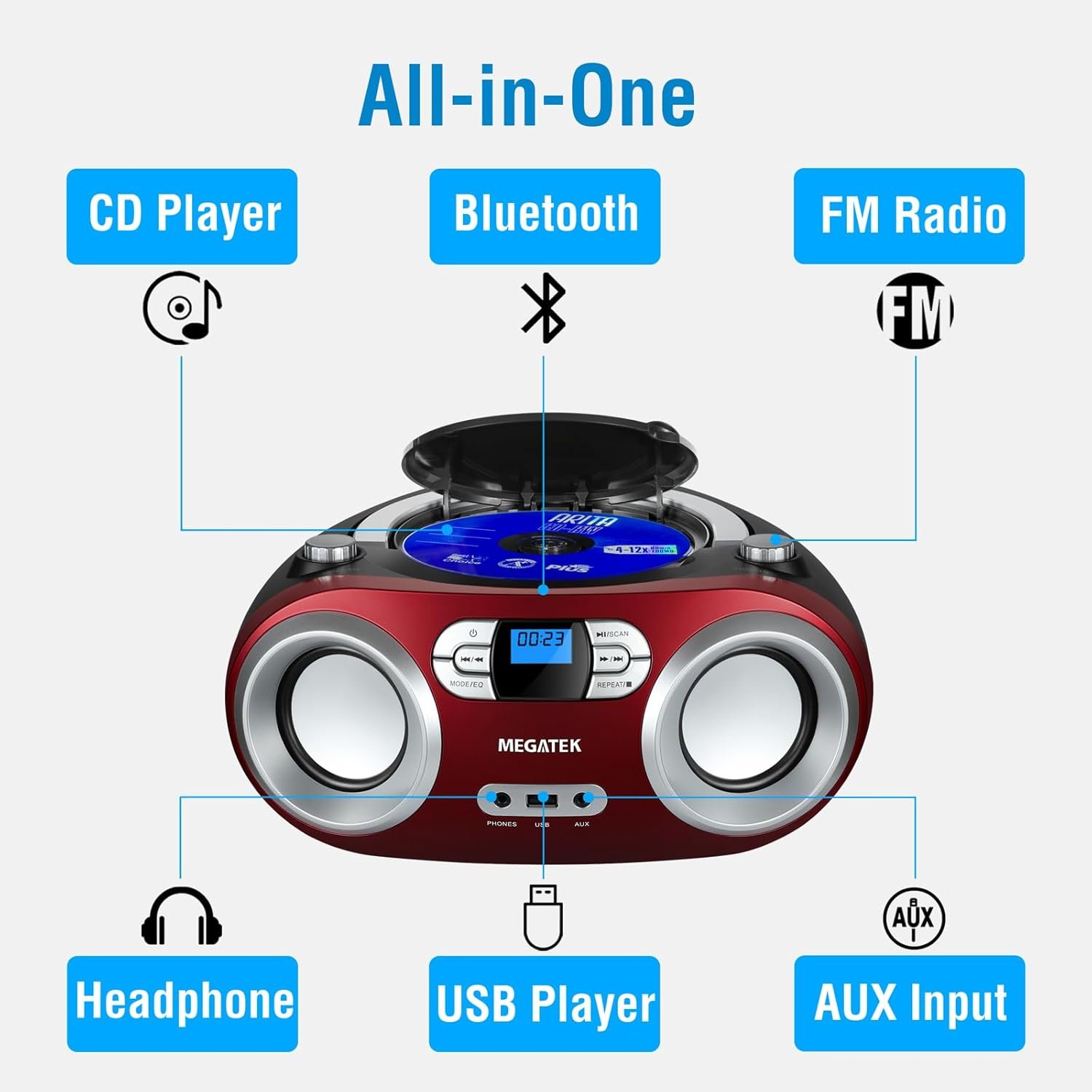 Enjoy portable audio at home or on the go with the stylish and easy-to-use MEGATEK CB-M25BT CD Boombox, with clear stereo sound from dual 3-inch front-firing speakers and your choice of CD, USB, Bluetooth, AUX In and FM radio playback.