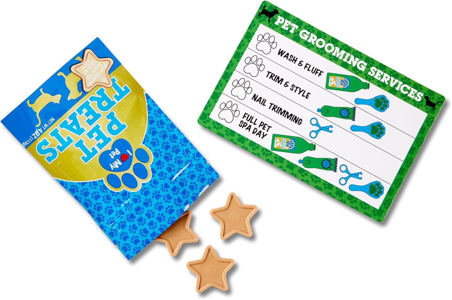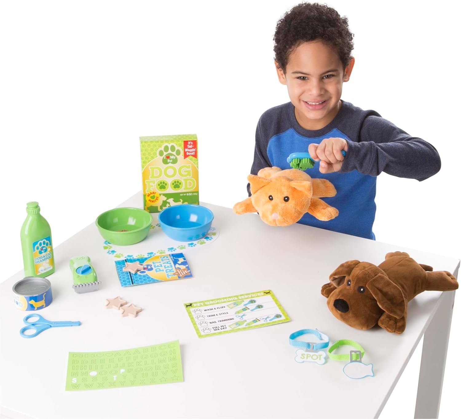 Includes pretend dog and cat food and treats, food bowls and mat, vibrating clippers, brush, nail clippers, 2 collars to personalize
