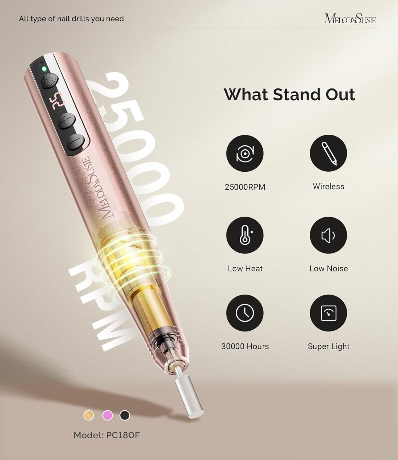 Multi-functional Manicure and Pedicure: Comes with 25,000RPM powerful rotary motor and 11 kinds of 3/32” mental nail drill bits, this electric nail file can be used for all-around shaping, buffing, grinding, polishing, removing for acrylic nails, poly gel nails, artificial extension nails, thick nails, builder gel, dip powder, fake nails, natural nails, and cuticle dead skin.