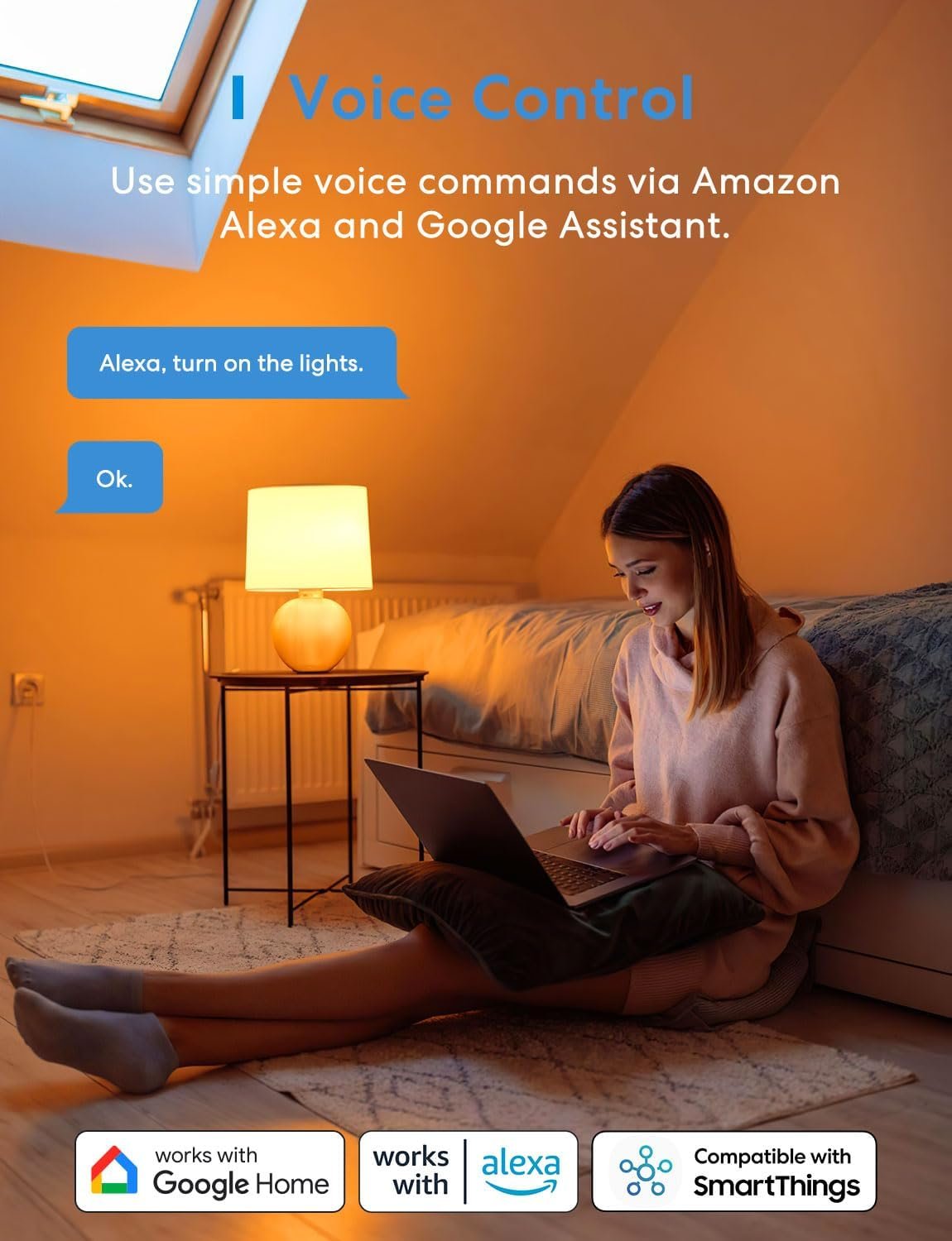 Smart light bulbs that work with Alexa Echo, Echo dot, Google Home Assistant, compatible with SmartThings. Control your smart bulbs via voice command to turn on/off or dim/brighten your smart LED light effortlessly