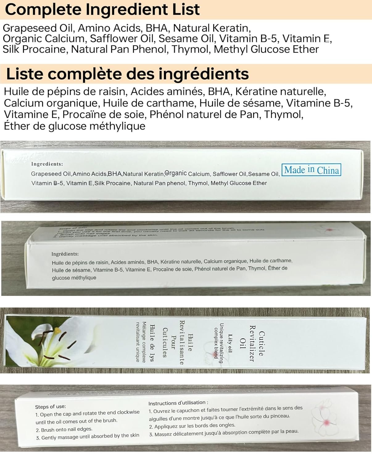 Perfect Funcation: The cuticle oil can softens and inhibits dead skin growth,Protects your hands from barbs,Reduce epidermal wrinkles, And promote healthy nail growth.Makes your hands smooth,Delicate and shiny.