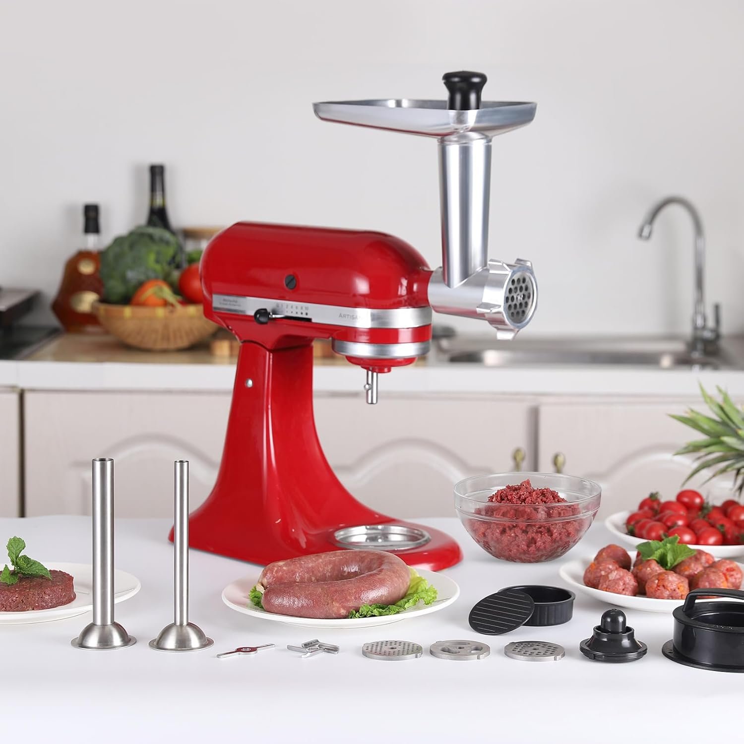 [Multifunctional Meat Grinder for KitchenAid Mixer]: This durable meat grinders grind meat faster and produces more flavorful meat than a manual meat grinder. It includes 4 unique grinding plates , 2 sausage stuffing tubes, 3 grinding blades, a sausage filling holder, a removable food tray, food pusher, and cleaning brush. It gives you a perfect and convenient food processing experience and efficiently produces healthy and delicious food.