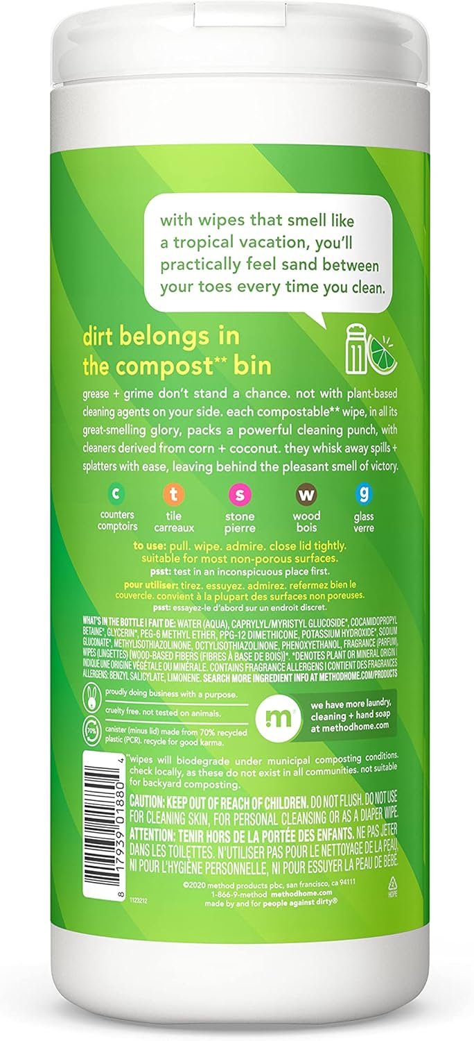 Method All-Purpose Cleaning Wipes, Lime+ Sea Salt, Multi-Surface, Compostable, 30 Count (Pack of 6)