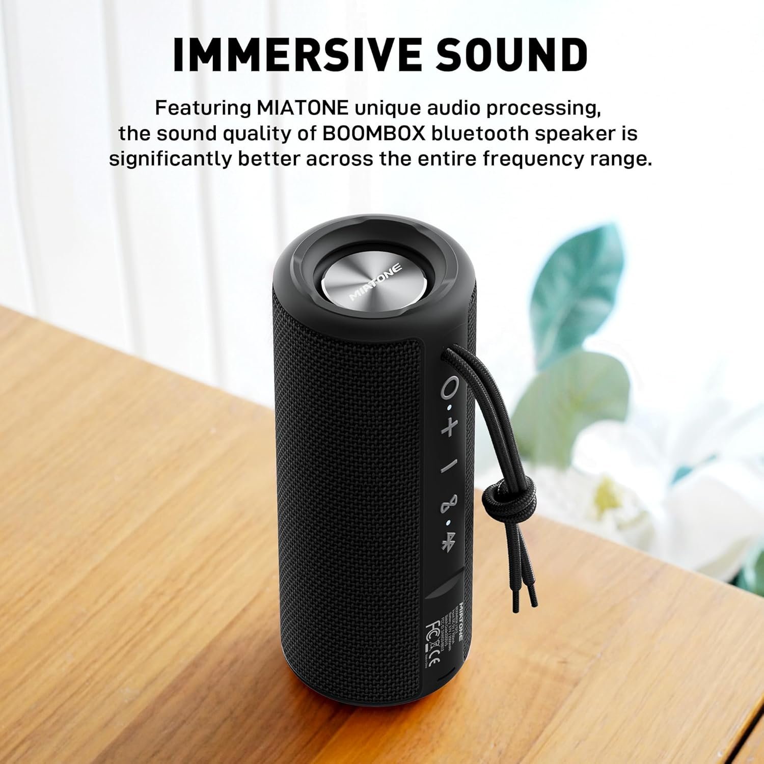 [Immersive Sound] The MIATONE audio processing makes the audio quality of the BOOMBOX bluetooth speaker better across all the frequency range from dual precision acoustic stereo drivers. Further, the crisp treble and mid frequencies are without noticeable crackle at maximum volume. Also, using the DSP technology, the dual advanced subwoofers and aluminum passive radiators on each ends boost deep and precise bass that is true to your music, without exaggeration and distortion.