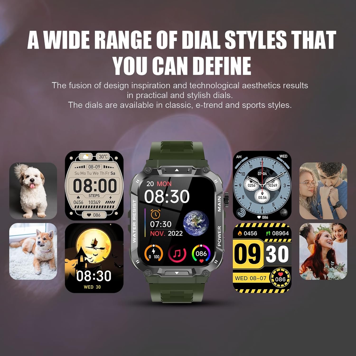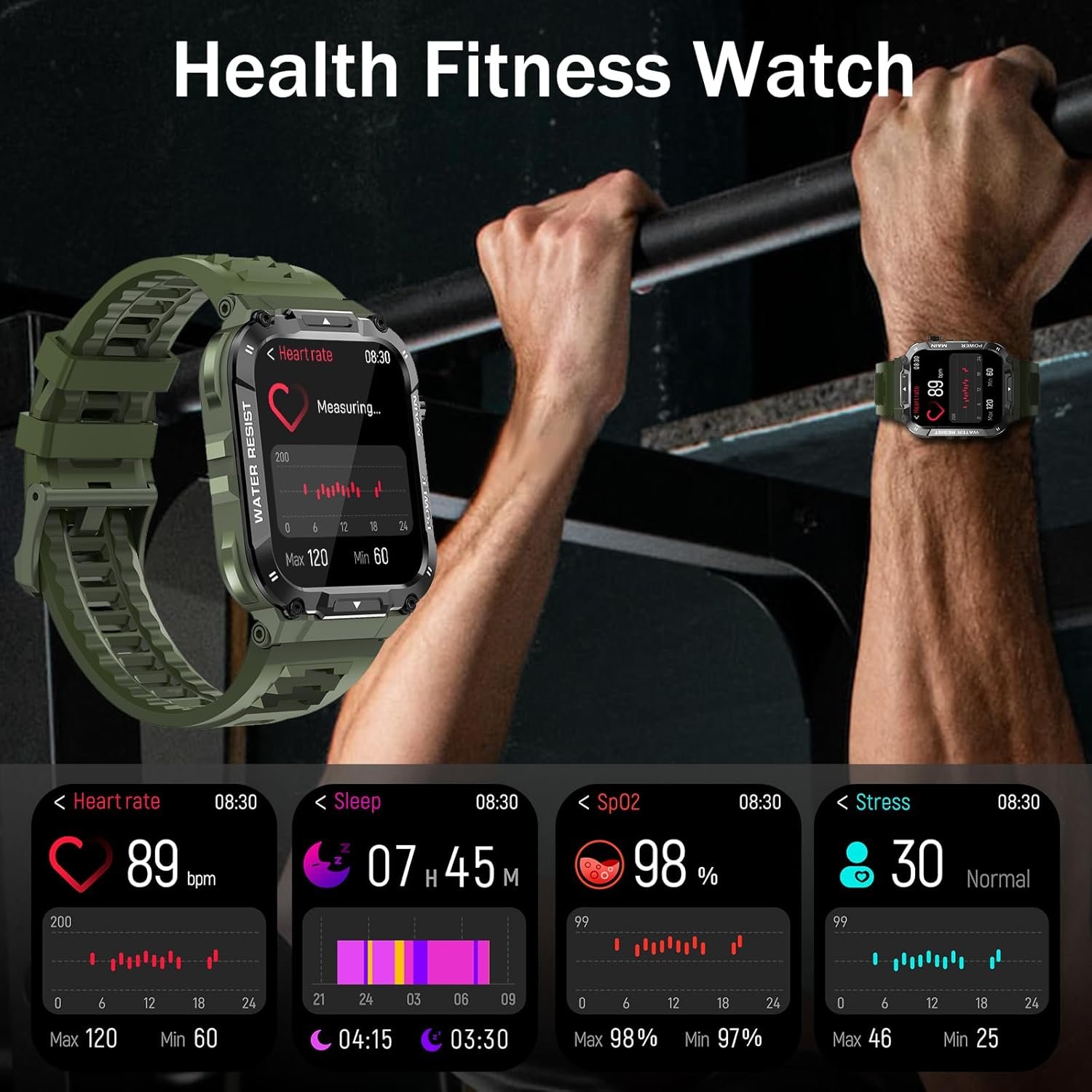 【Durable Military-grade Construction】The Smart Watch is made from a special aluminum alloy material, our Military Smart Watch for Men has undergone rigorous military-grade testing, including extreme temperature, low pressure, and dust resistance. This watch can withstand harsh environmental conditions, making it the perfect companion for outdoor adventures.