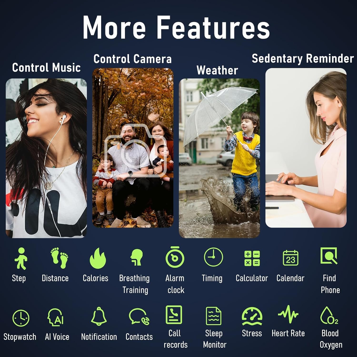 Customized Dials & More Functions: Over 100+ dials for download and change, you can also use your favorite photos as dials. More useful functions (AI voice control, calculator, photo control, music control, weather forecast, alarm clock, stopwatch, sedentary reminder, brightness adjustment, language setting, view calendar, find phone and watch, etc.) to meet daily needs