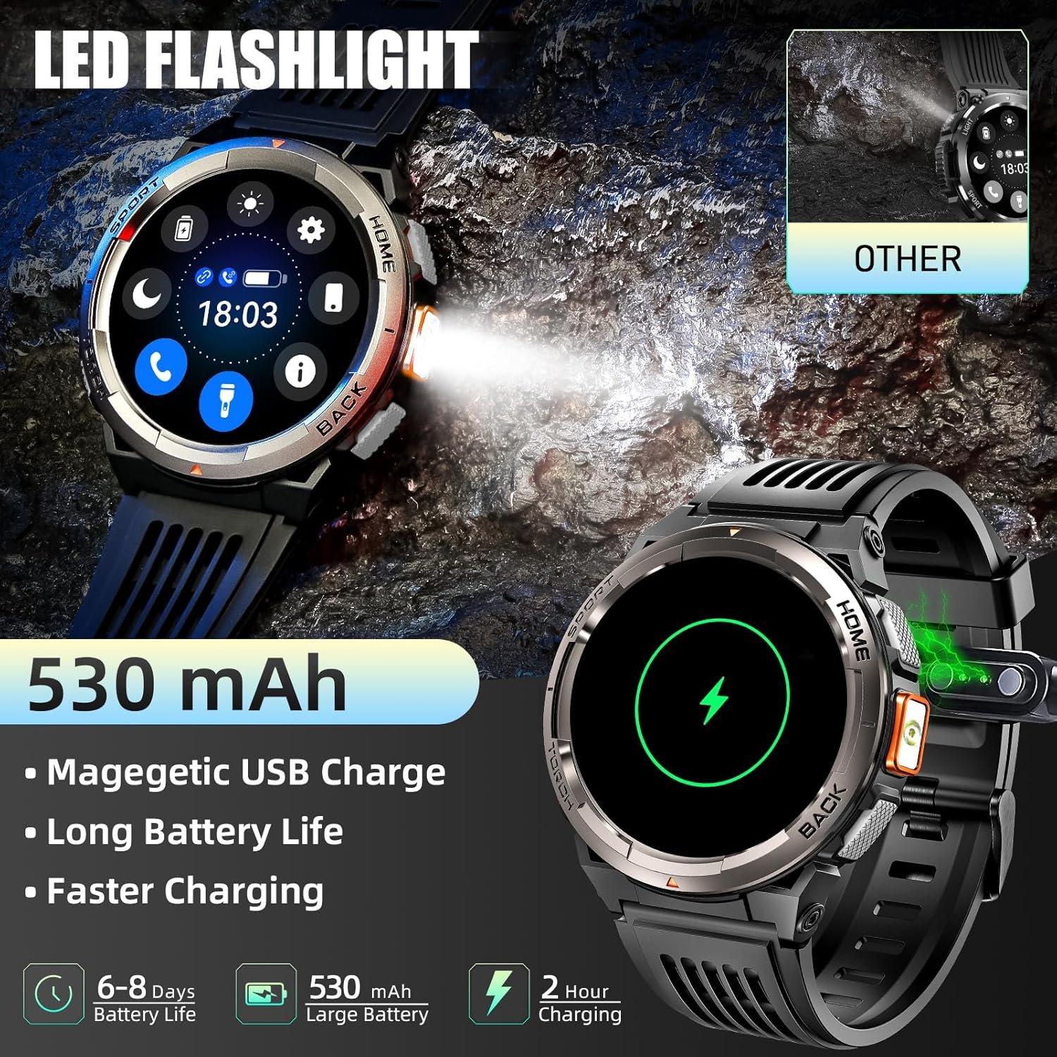 【Essential for Outdoor & Travel】- LaNikar rugged smart watch is equipped with a bright LED flashlight, with a lighting distance of up to 6-8m, and a built-in 530mAh large battery to ensure battery life, so you are no longer afraid of the dark when traveling! The outdoor smart watch adds the latest compass altitude and barometer functions to help you pay attention to the direction, altitude, and air pressure in real-time when outdoors, allowing you to move forward bravely and explore the world!