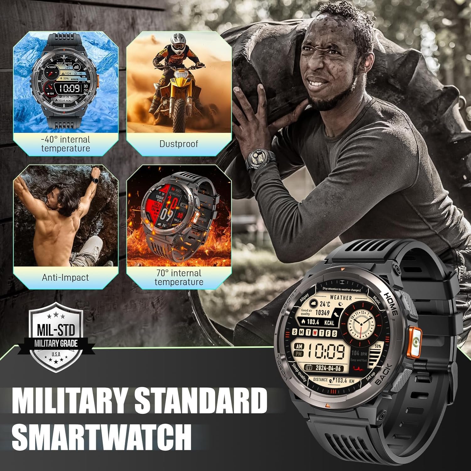 【Military Standard & 3ATM Waterproof】- LaNikar military smart watch for men uses aerospace-grade metal, a 9H excellent hardness glass screen, and a fully enclosed 3ATM waterproof design, which is strong enough to withstand extreme environments and tests. LaNikar tactical smartwatches for men have passed multiple military-grade tests such as extreme temperatures, low pressure, dust resistance, and water resistance. In daily life, you can also wear it for swimming, diving, and other water sports!