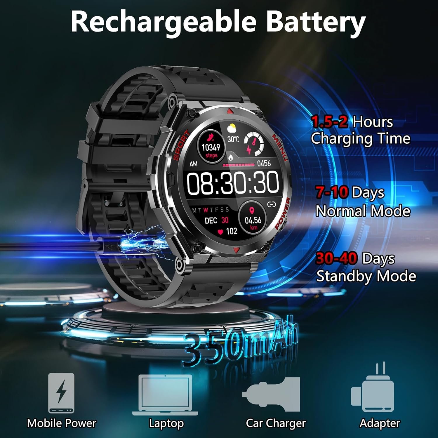 【 Rechargeable & Large Battery】– The military smart watches for men is built in a 350 mAH rechargeable battery, which use magnetic fast charging cable to charge, charging time 1.5-2 h. Standby Mode: Battery life 30-40 Days. Normal mode: Battery life 7-10 Days. The fitness watch also can be charged by mobile power, laptop, car charger or other usb devices.