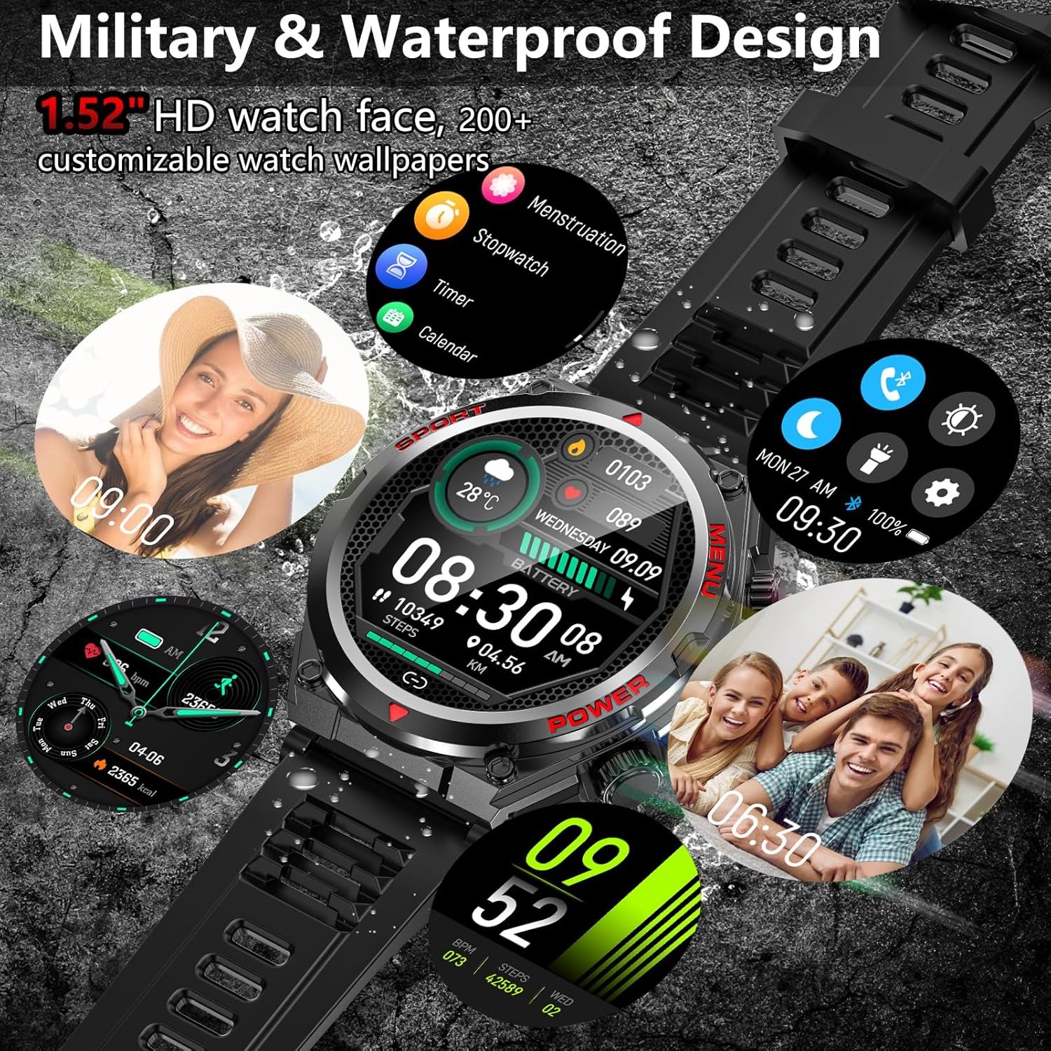 【 Military Smart Watch Design】– The smart watch for men women is made of titanium alloy and silicone material, featuring a military and modern style. Solid titanium alloy of watch face is I68 waterproof, shockproof and dustproof for professional outdoor sports and adventures. Round fitness watch is equipped with 1.52″ HD touch screen and 200+ smart watch wallpapers to choose to satisfy diverse aesthetics.