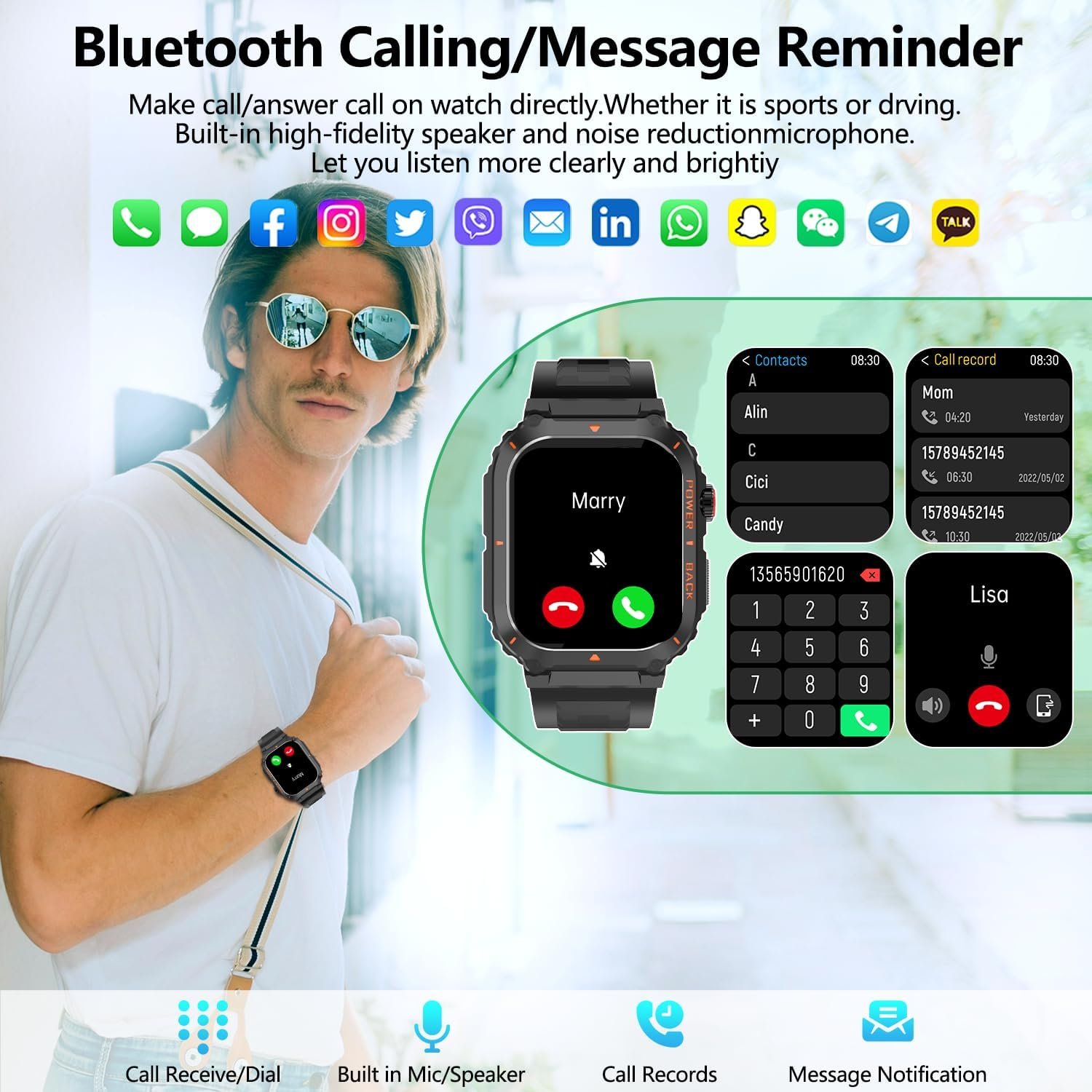【Answer/Make Calls】This fitness watch come with built-in HiFi stereo speakers and microphone. Once connected to Bluetooth, you can directly answer or make calls through the smartwatch. The “hanfit” app stores multiple contacts, ensuring you stay connected with family and friends anytime, anywhere. Receive real-time notifications on the smartwatch for incoming calls or messages (WhatsApp, Facebook, Instagram, etc.).