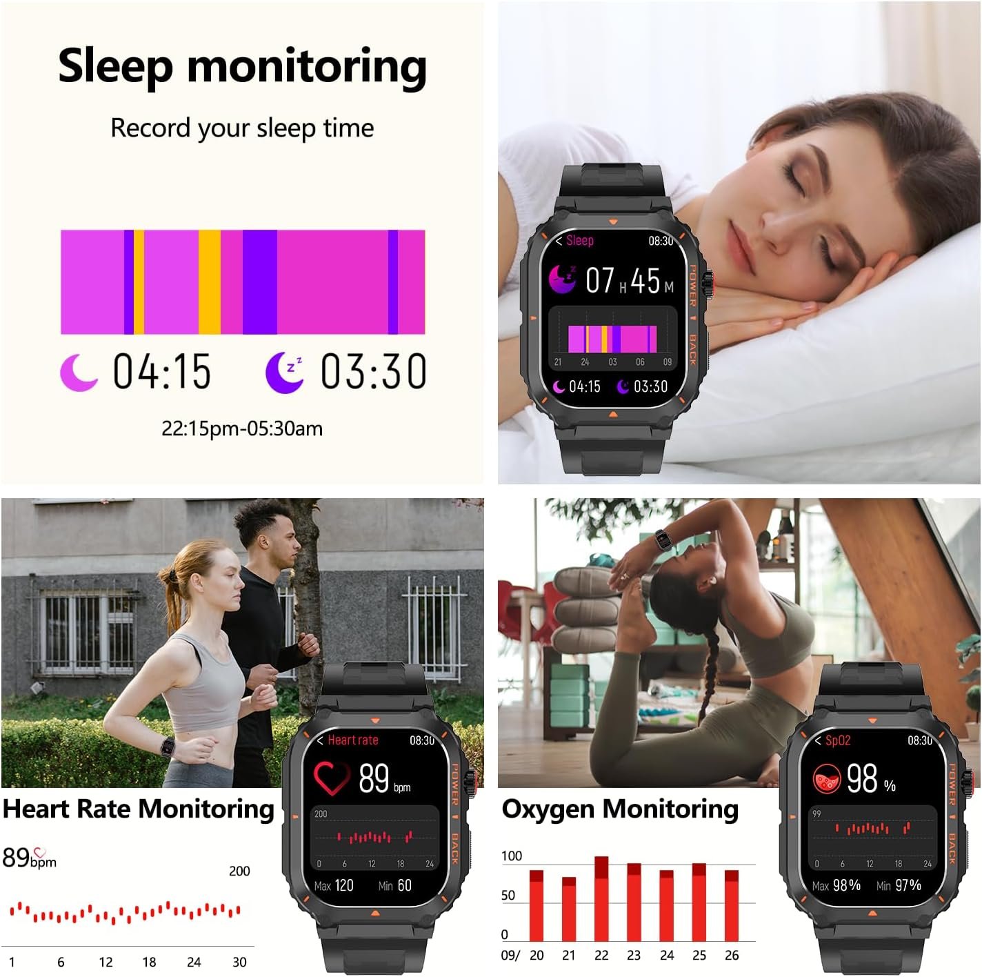 【Monitor Health in Real Time】The fitness watch for women and men uses high-performance optical sensors to monitor dynamic heart rate in real time 24/7. It can also accurately track your personal sleep and detect blood oxygen saturation and stress levels to adjust your physical condition in a timely manner. The app even offers a detailed sleep quality analysis report (light/deep/awake sleep stage), helping you adjust your lifestyle towards a healthier lifestyle. (*NOTE: This watch cannot be used as a medical diagnostic tool.)