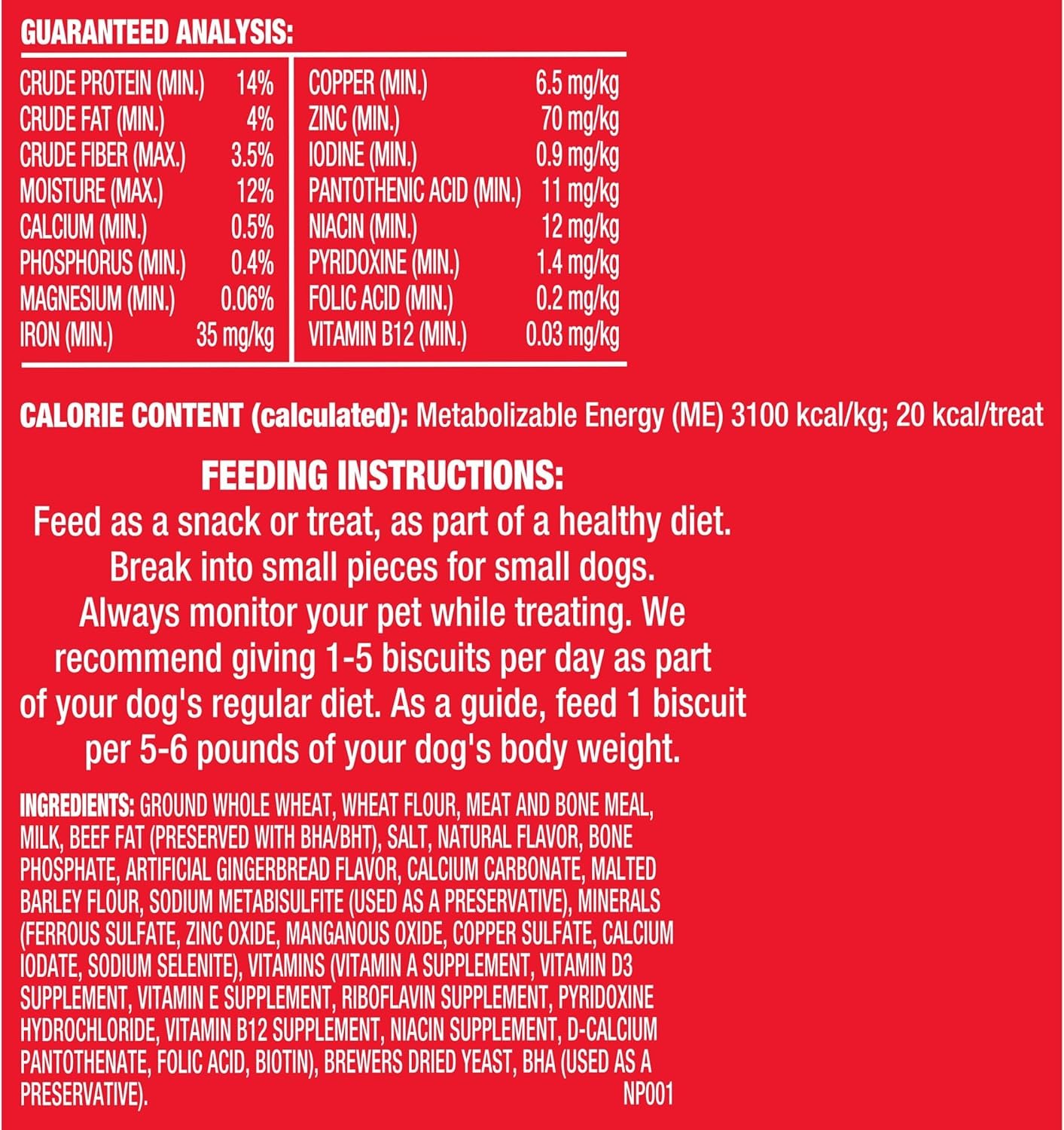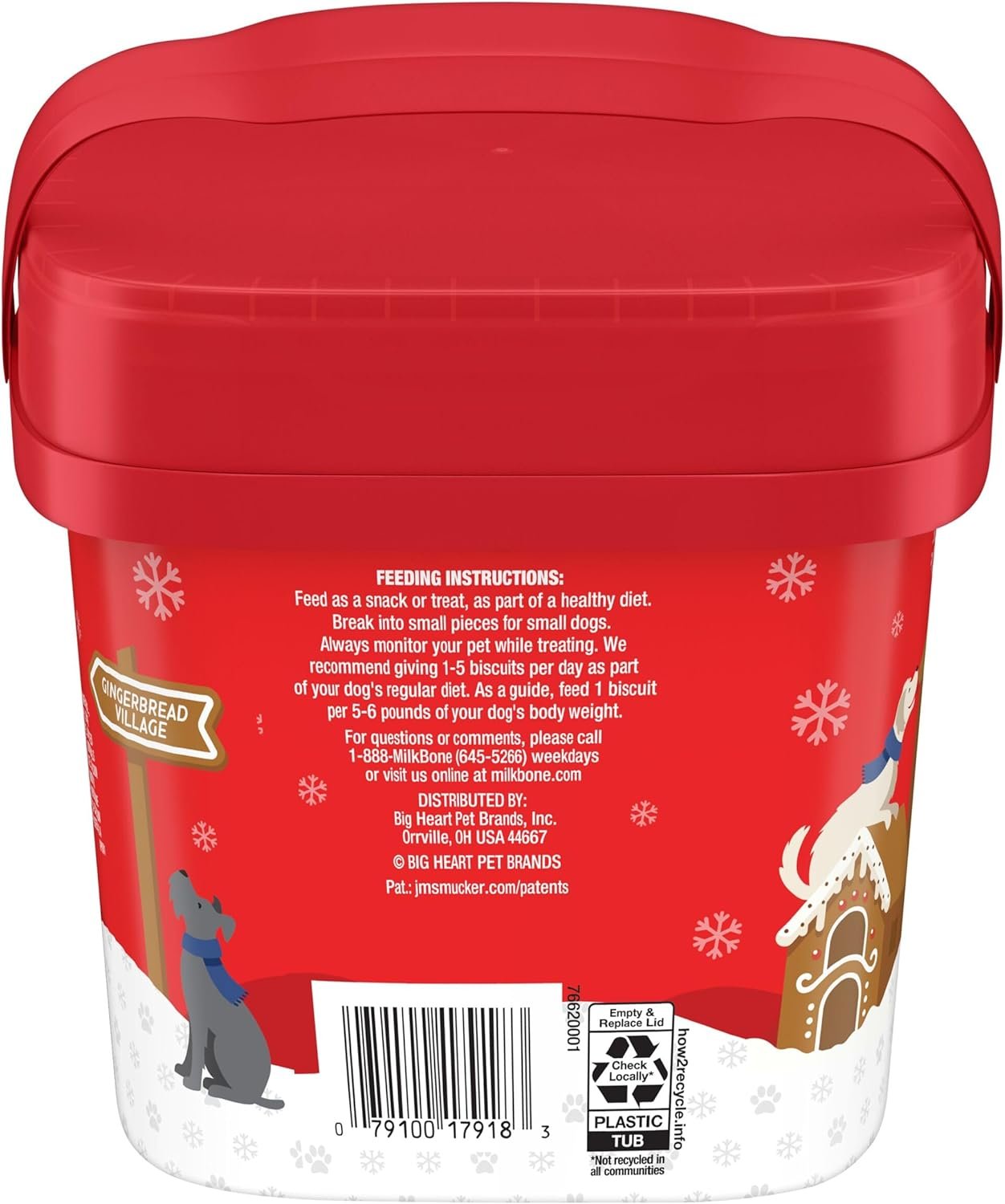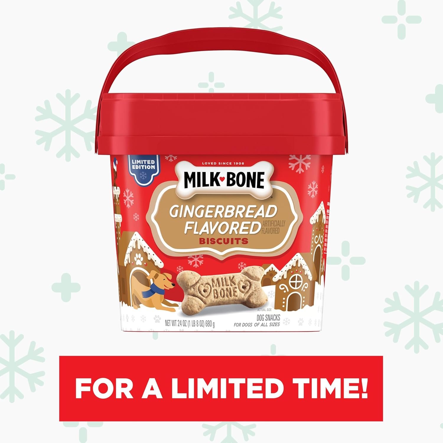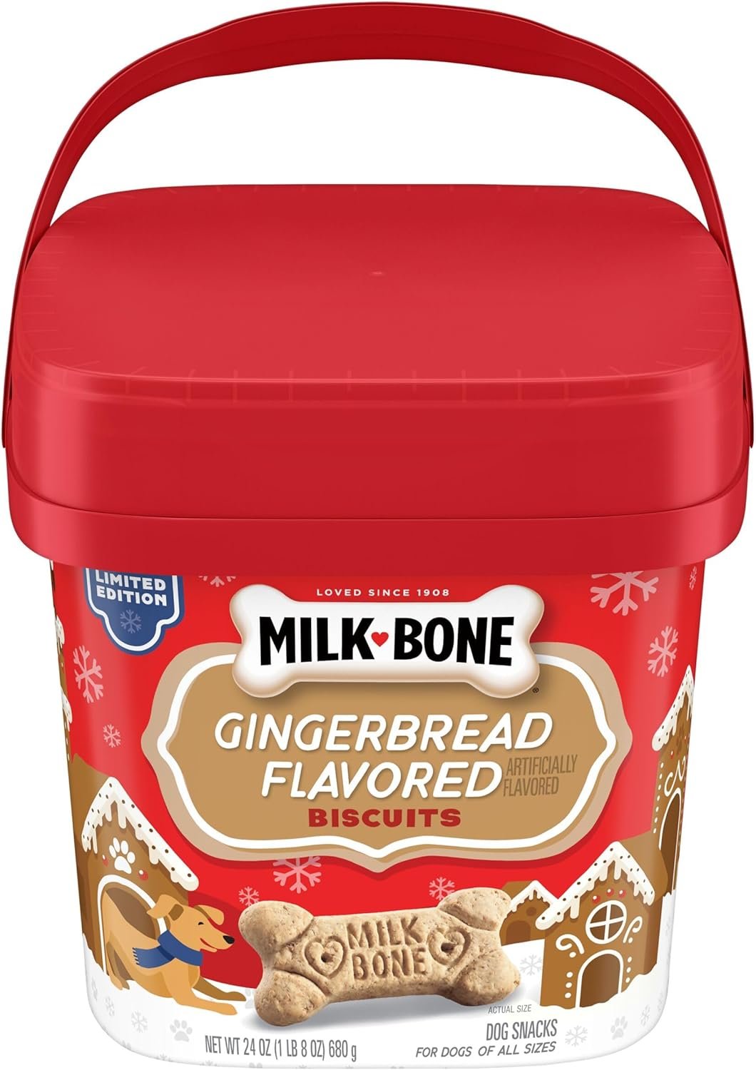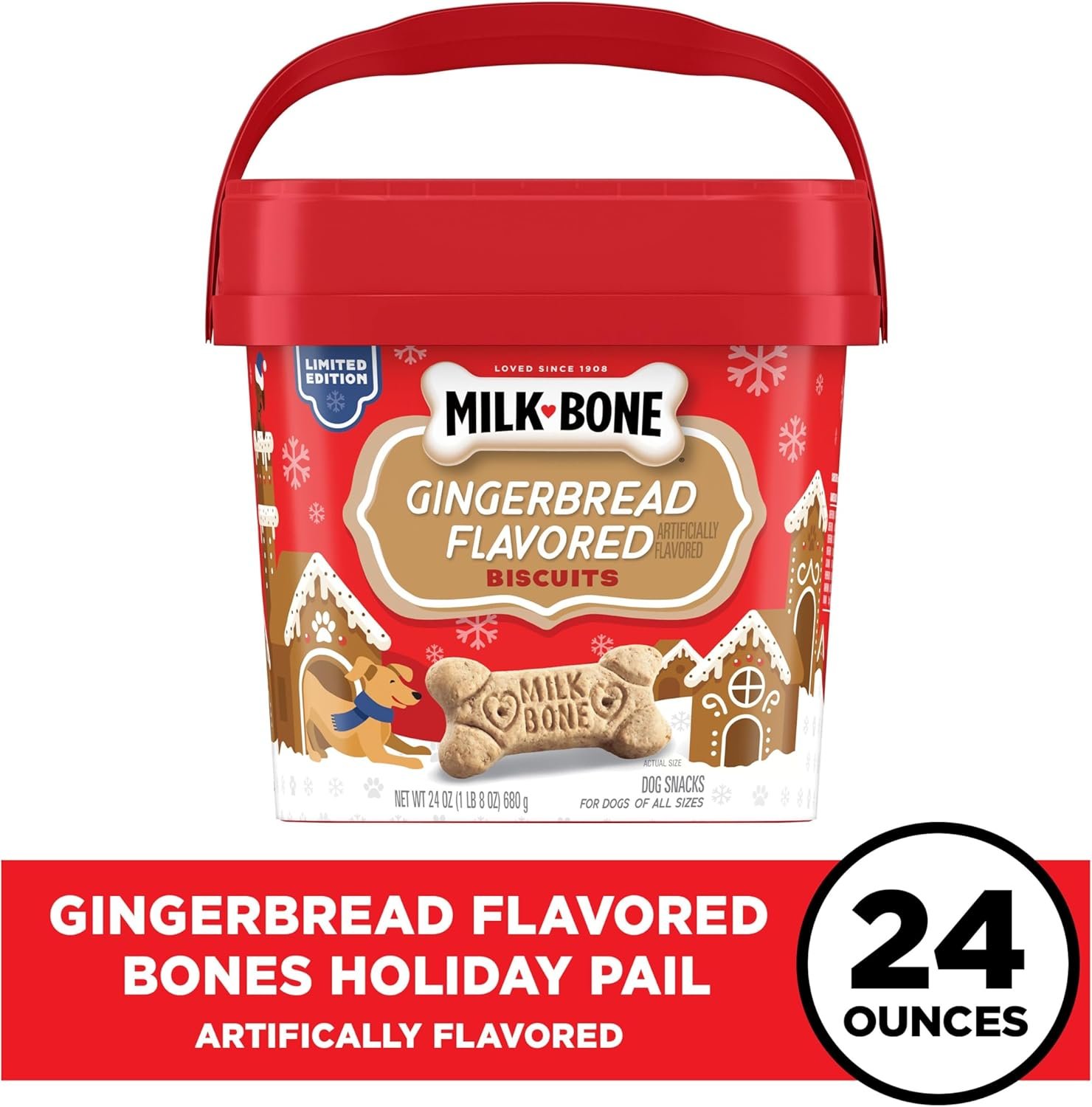 Contains (1) 24 Ounce Pail of Limited Edition Milk-Bone Gingerbread Artificially Flavored Biscuits