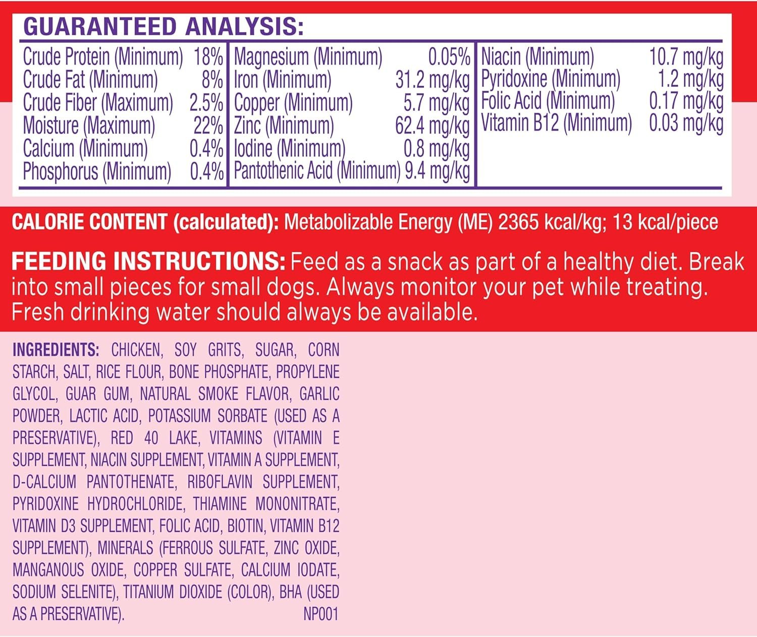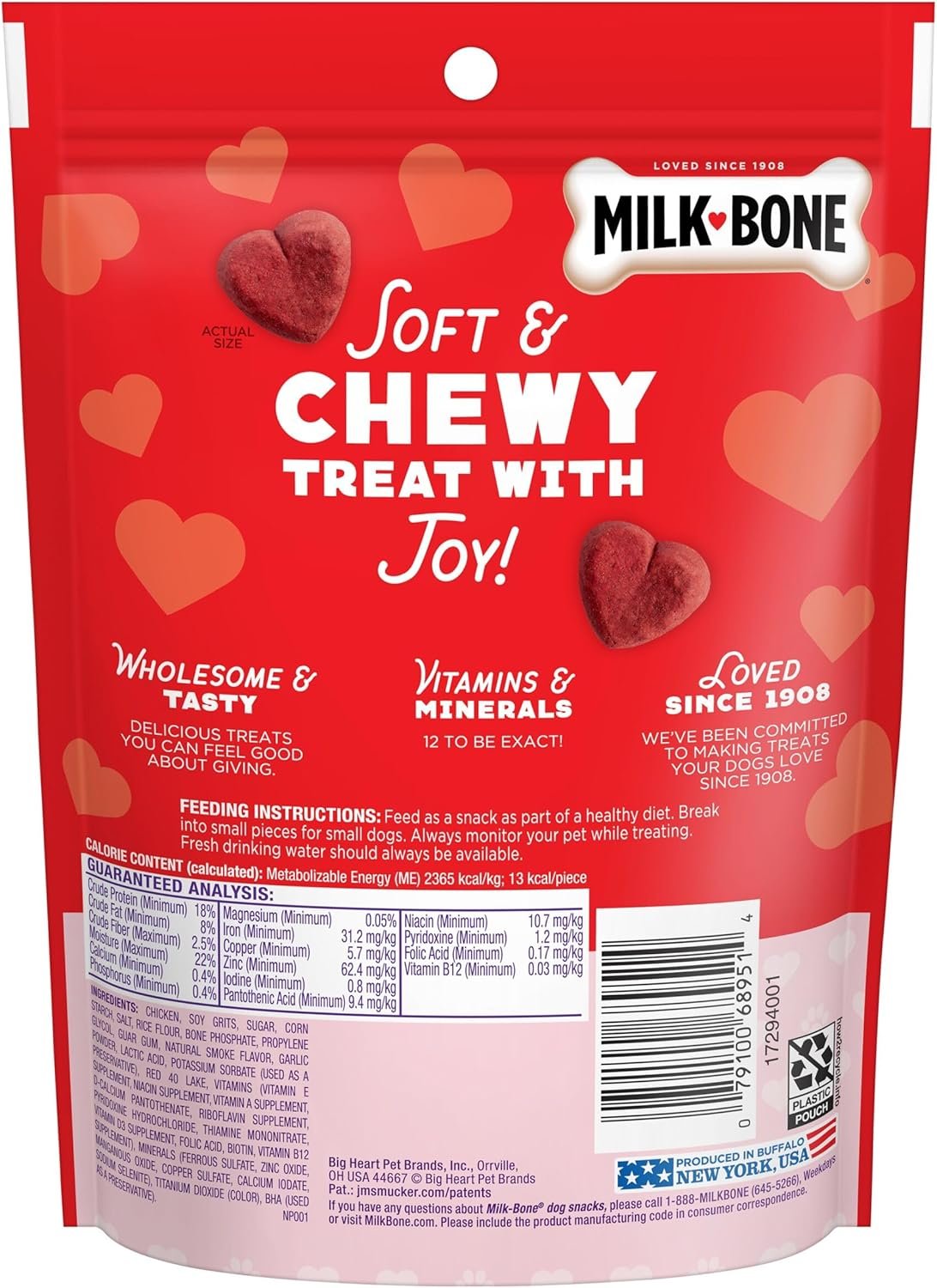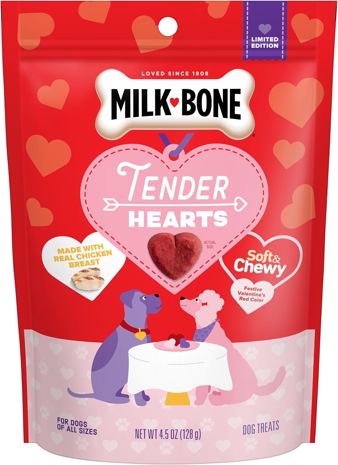 Contains ten (10) 4.5-ounce bag of Milk-Bone Tender Hearts dog treats
