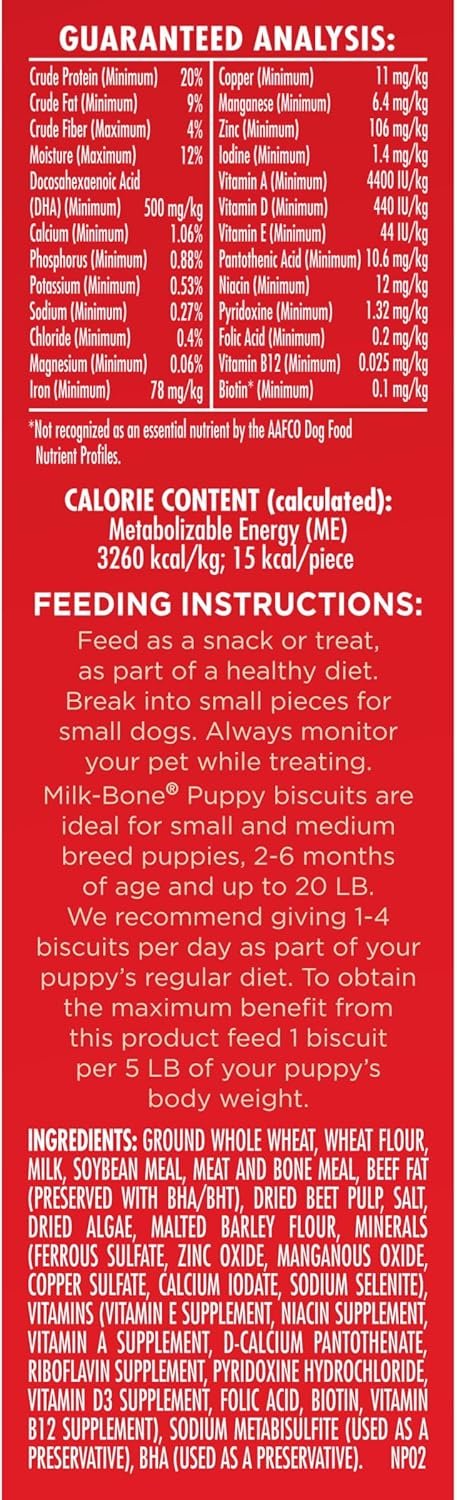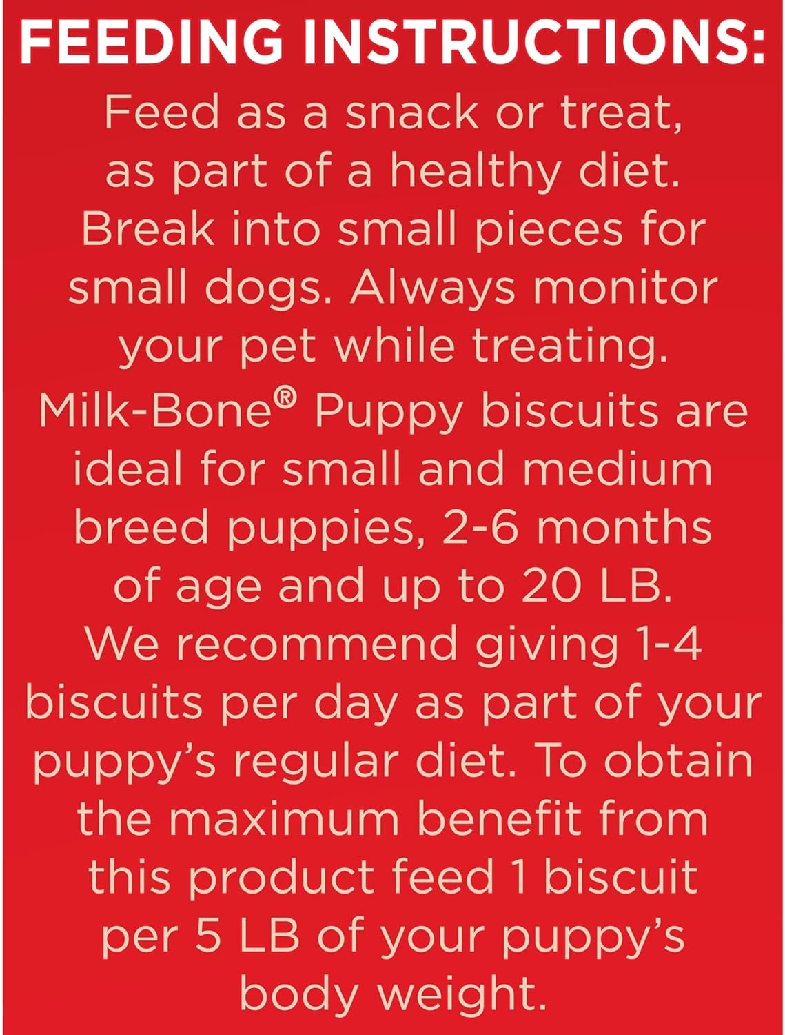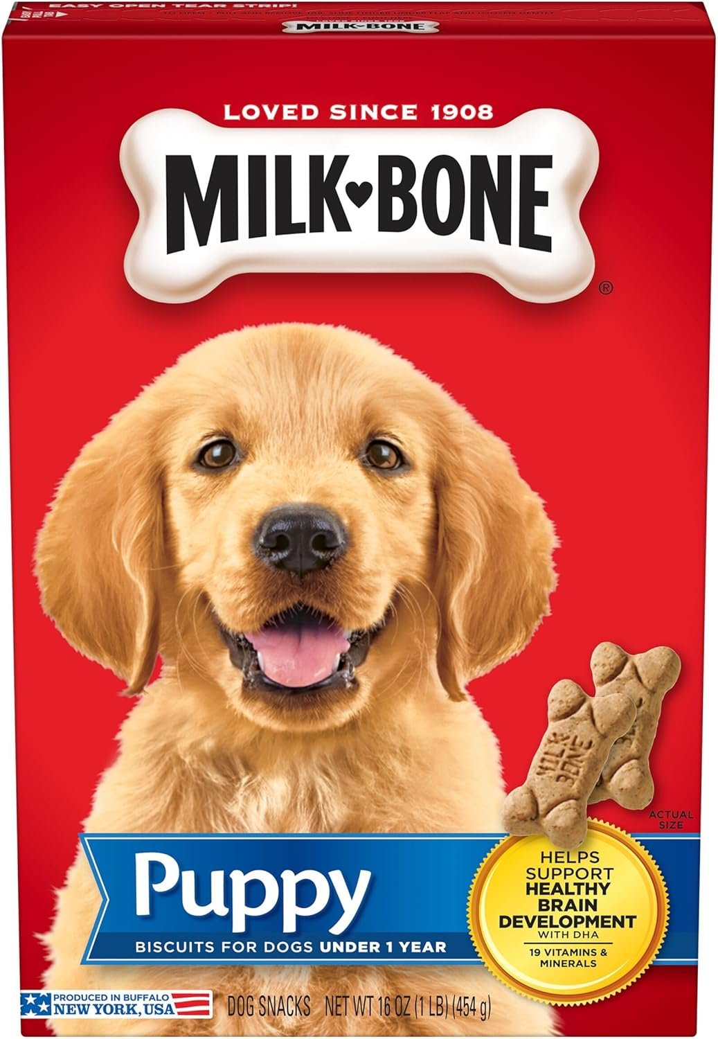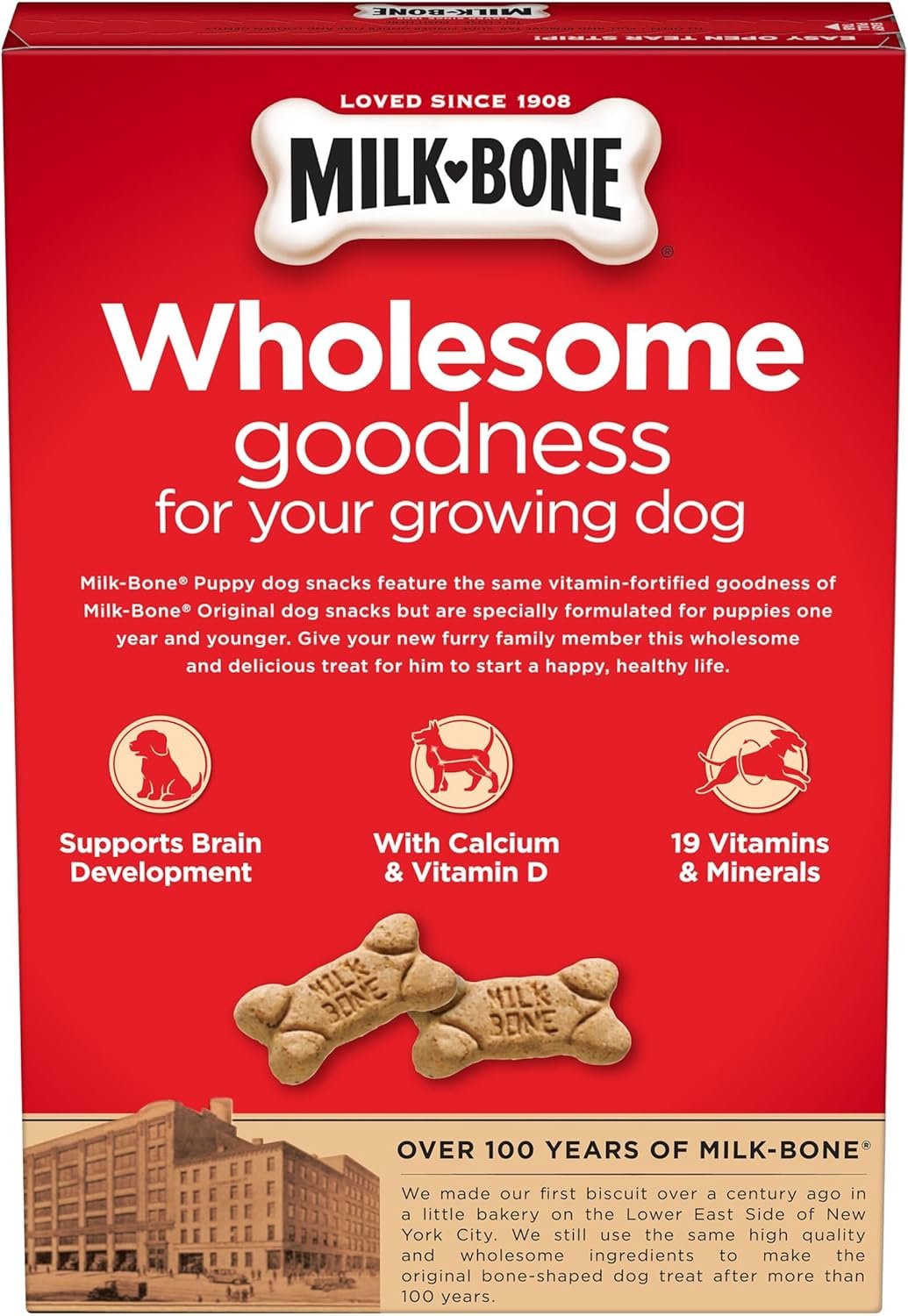 Milk-Bone Puppy Biscuits feature the same teeth-cleaning and vitamin-enriched goodness of Milk-Bone Original biscuits but are specially formulated for puppies 1 year and younger. Give your new furry family member this wholesome and delicious treat to start a happy, healthy life.