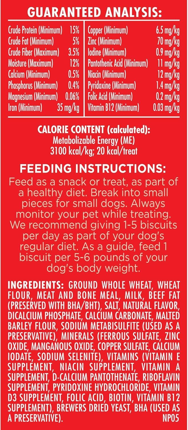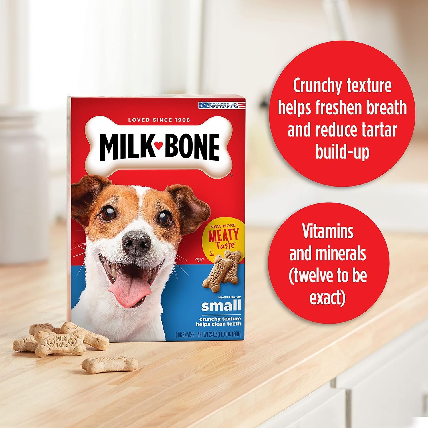 Make your dog′s life more fun with delicious dog snacks from a brand you can trust. Milk-Bone Original dog biscuits are prepared with care and will give your dog the simple, genuine joy that your dog gives you every day. How? A classic crunch with a wag-worthy taste — now with even MORE meaty taste compared to the Milk-Bone Original biscuits you know and love. Better yet, the crunchy texture of Milk-Bone dog biscuits helps freshen dogs′ breath and reduce tartar build-up, so you can fully enjoy all those sloppy doggie kisses. These tasty dog treats even contain vitamins and minerals — 12, to be exact. So you′ll be almost as happy to give them as your dog is to get them … almost.