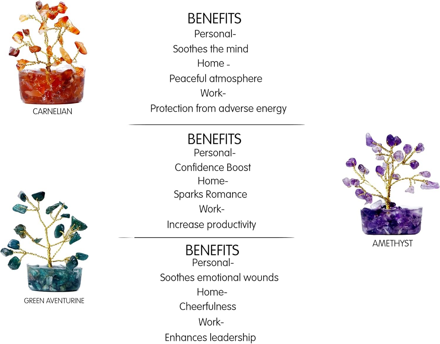 SET OF 12 MINI CRYSTALS TREES: This product includes a set of 12 handcrafted crystal trees, each featuring a different crystal, allowing you to experience the benefits of various crystals for harmonize positiveness, good vibes, chakra balance, and overall well-being.