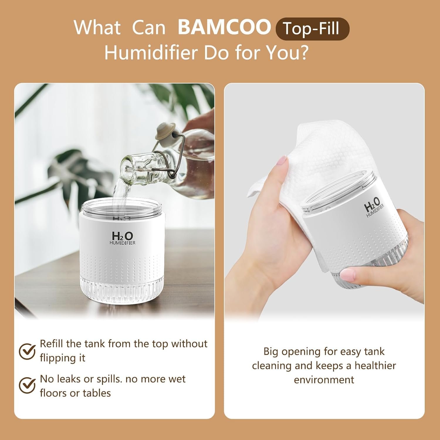 【Top-fill & Easily Clean】The small humidifier for bedroom no need to flip the water tank or spill water everywhere. Just ONE-STEP to remove the cover and easily fill the tank. Easily clean the inside of the tank through the humidifiers’ large opening, leaving no hard-to-reach corners during cleaning. So much easier to maintain and clean than larger humidifiers. Keeping healthy has never been easier