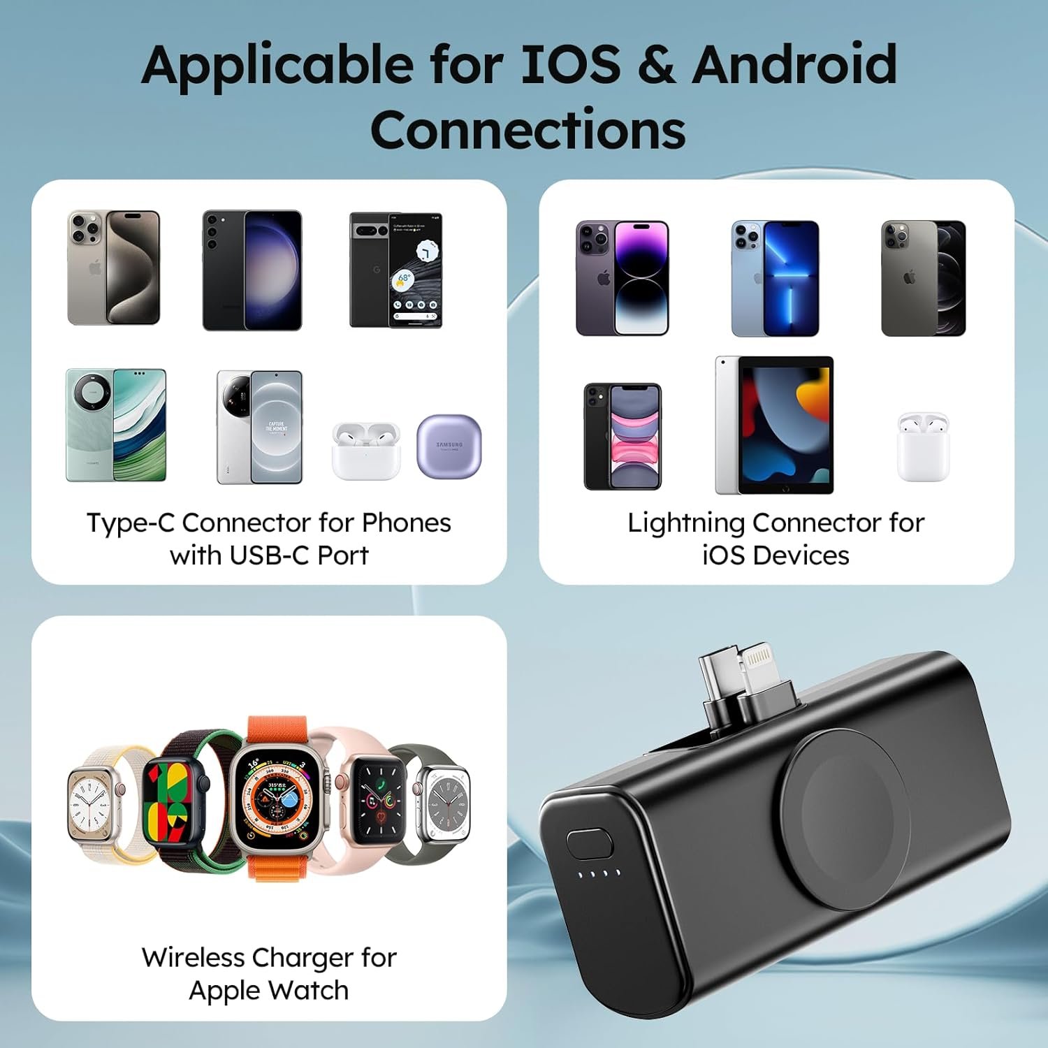 5000mAh Small Portable Charger: This 3 in 1 portable charger features built-in connectors for charging iPhone, Android phones with USB C and Lightning connector. It is a perfect portable charger usb c for iPhone 16/16 Plus/16 Pro/16 Pro Max/15/15 Plus/15 Pro/15 Pro Max/14/13/12, Samsung Galaxy S24 Ultra/S23+/S23/S22 and other phones. Additionally, it includes a 5000mAh wireless powerbank for Apple watch ONLY, and it’s not for other watches. Great iWatch charger for Apple Watch Ultra 2/Ultra/10/9/8/7/6/5/4/3/2/SE, AirPods Pro/4/3/2