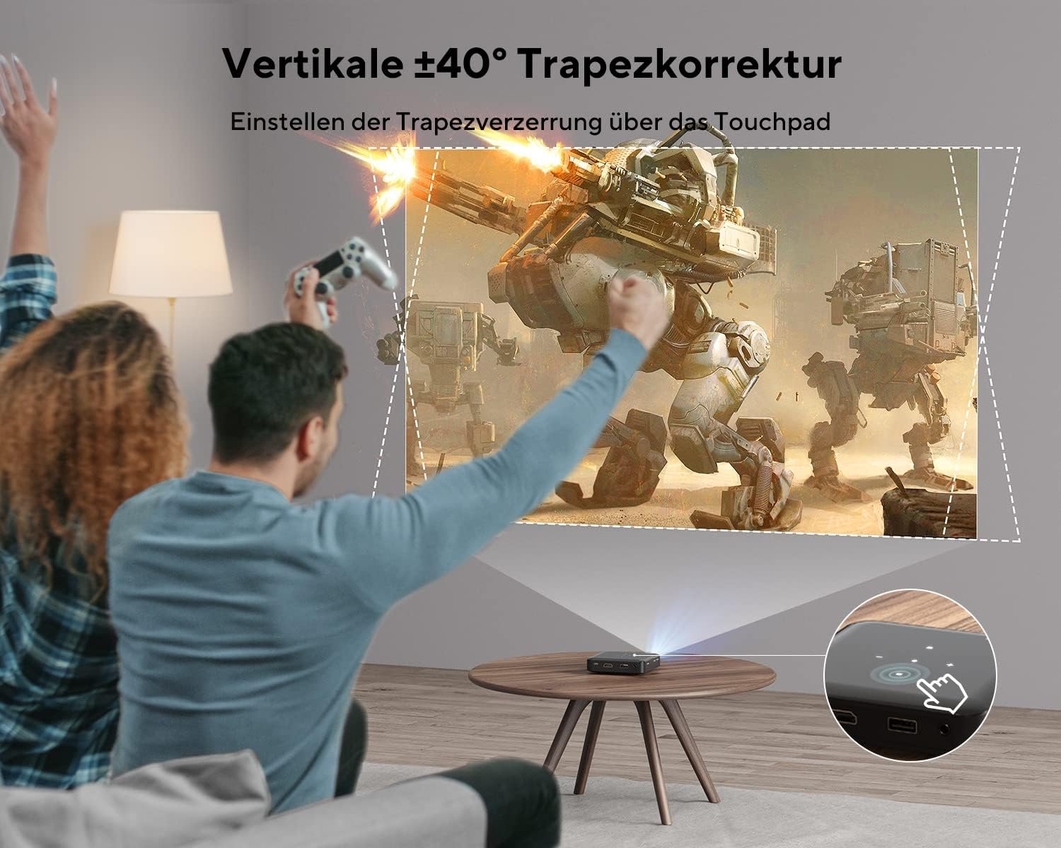 With a powerful DLP chip, built-in 854*480p resolution, 120 ANSI lumens and three-stage adjustable brightness, you can enjoy clear and bright imaging even in dark environments. The projector is available in projection sizes of 30-120 inches and is equipped with ±40° vertical keystone correction for rectangular imaging.