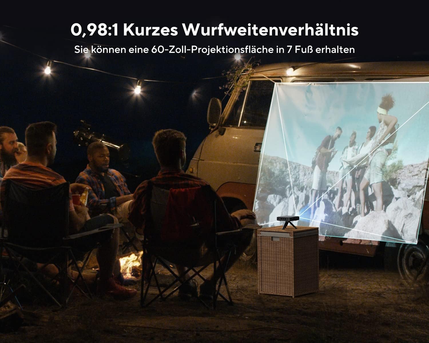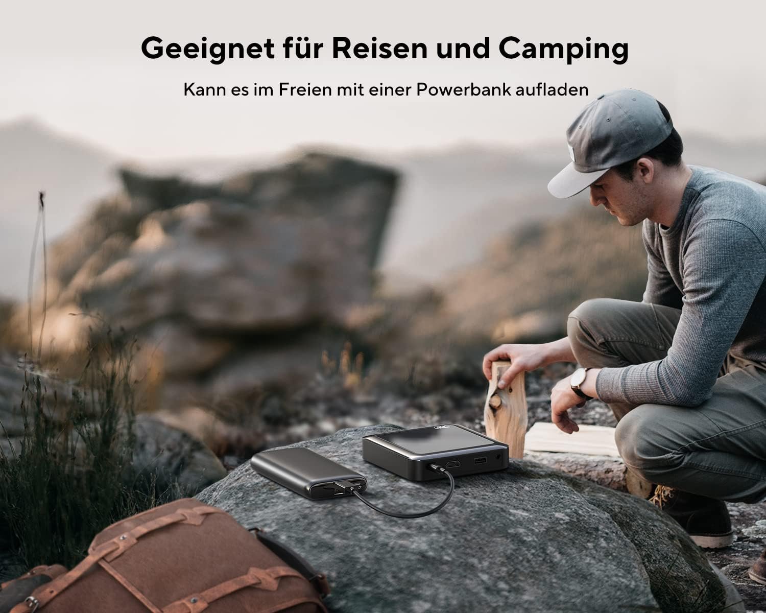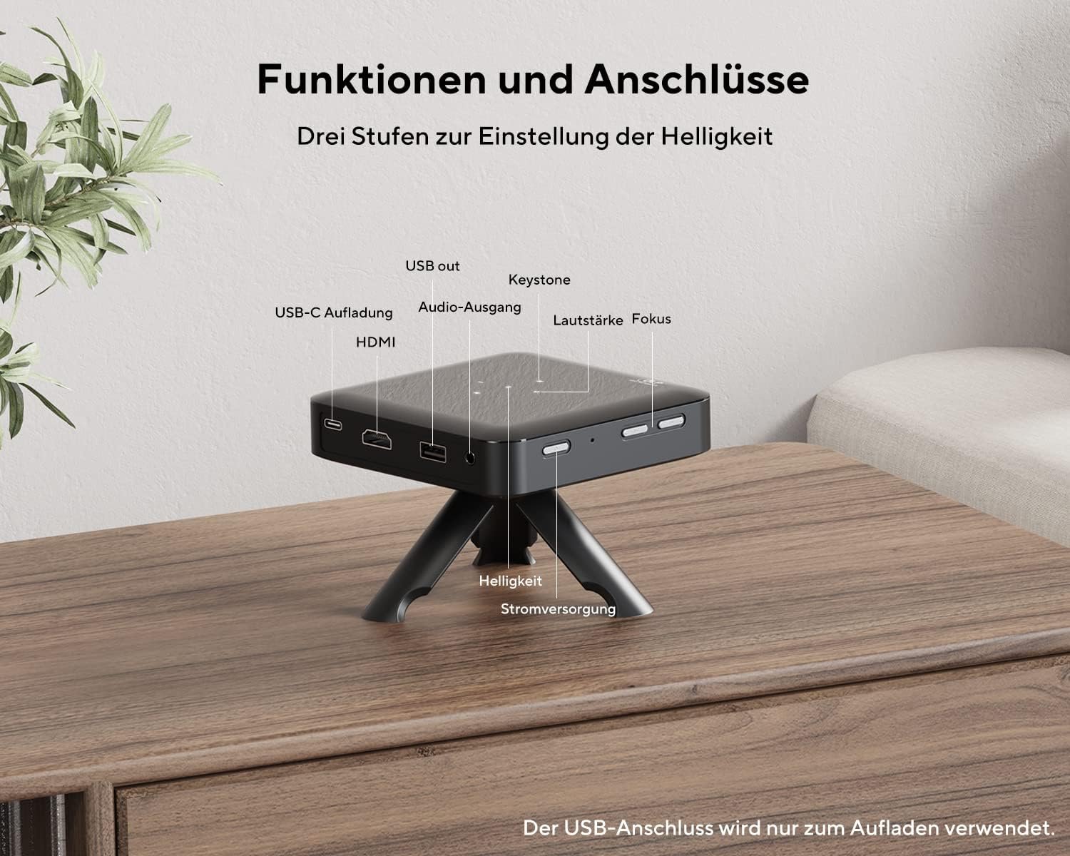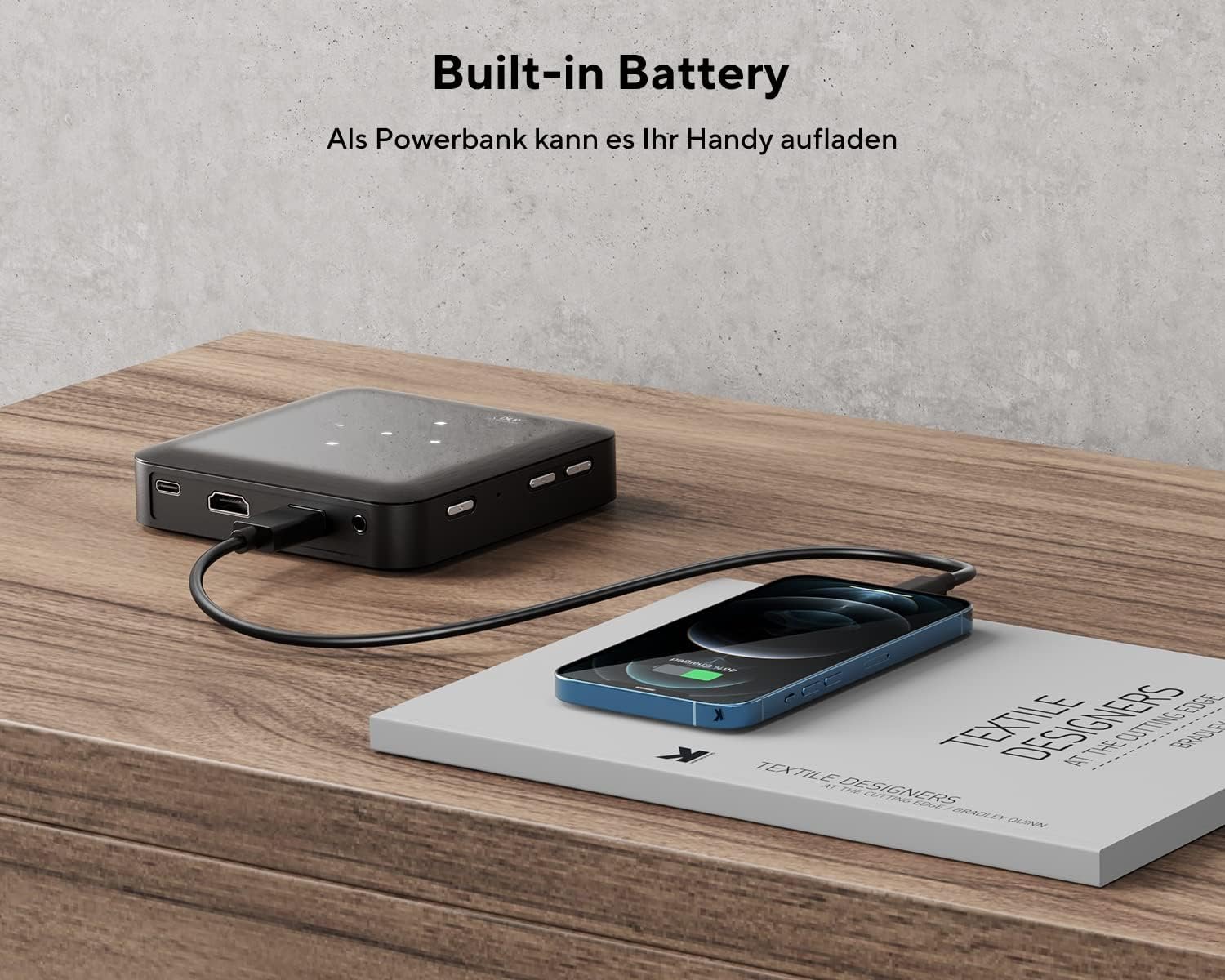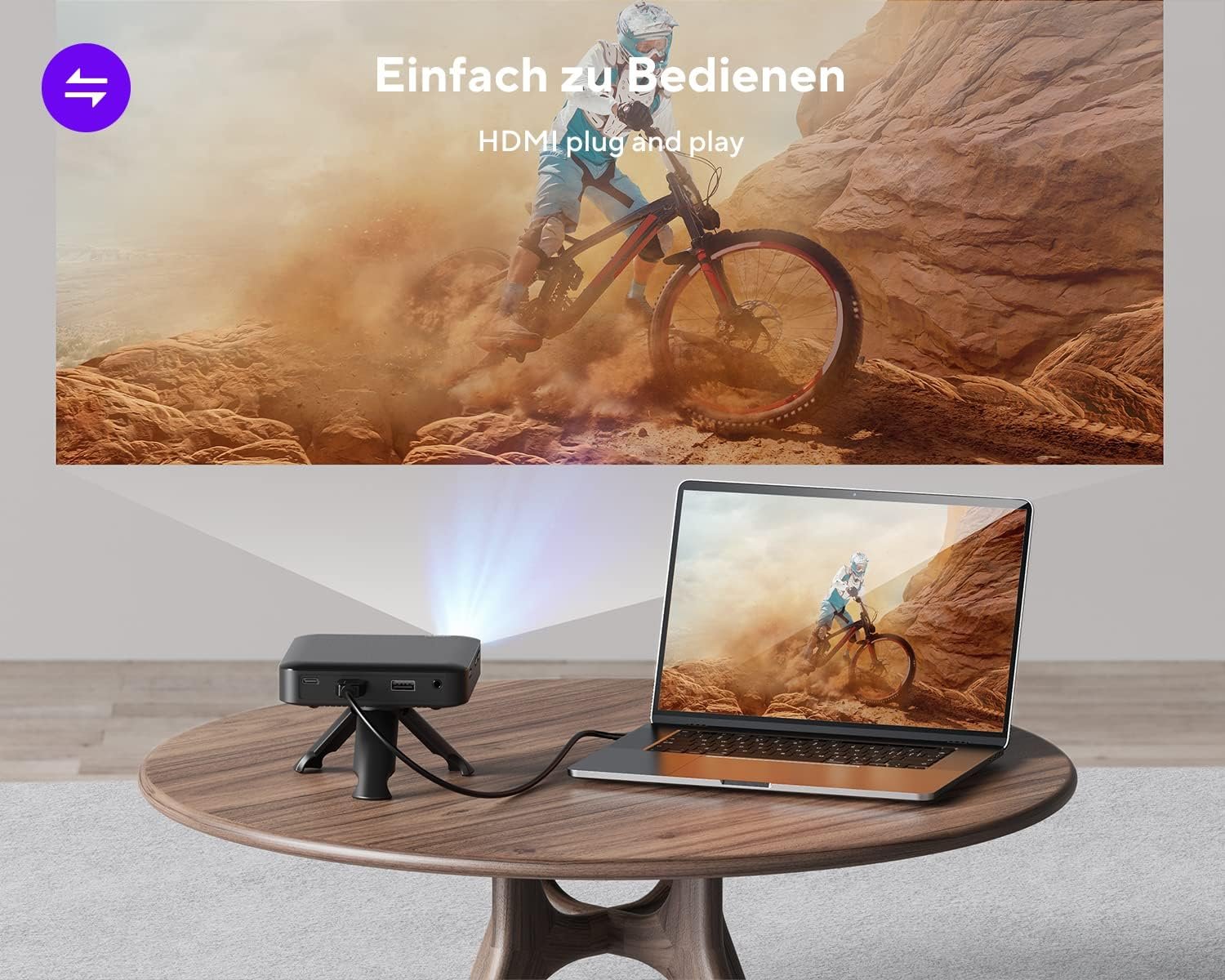 Simple UI design, HDMI plug-and-play. Playback time is 1.5 hours using the USB-C charging port, or if there is no available outlet, you can use a mobile power source or laptop to charge. It can also be used as a mobile power source to charge your phone. With the included tripod, the portable projector can be used for clear outdoor viewing.
