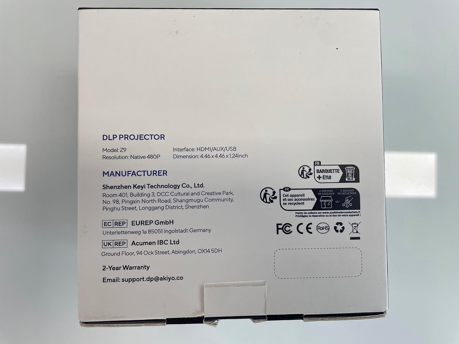 AKIYO Z9 DLP projector fits in the palm of your hand, easy to enjoy home theater and outdoor entertainment anytime, anywhere, whether traveling or camping is a good choice. Size: 10.5*10.5*2.5cm, weight: 280g. Stylish design and piano baking lacquer finish to create a stylish appearance.