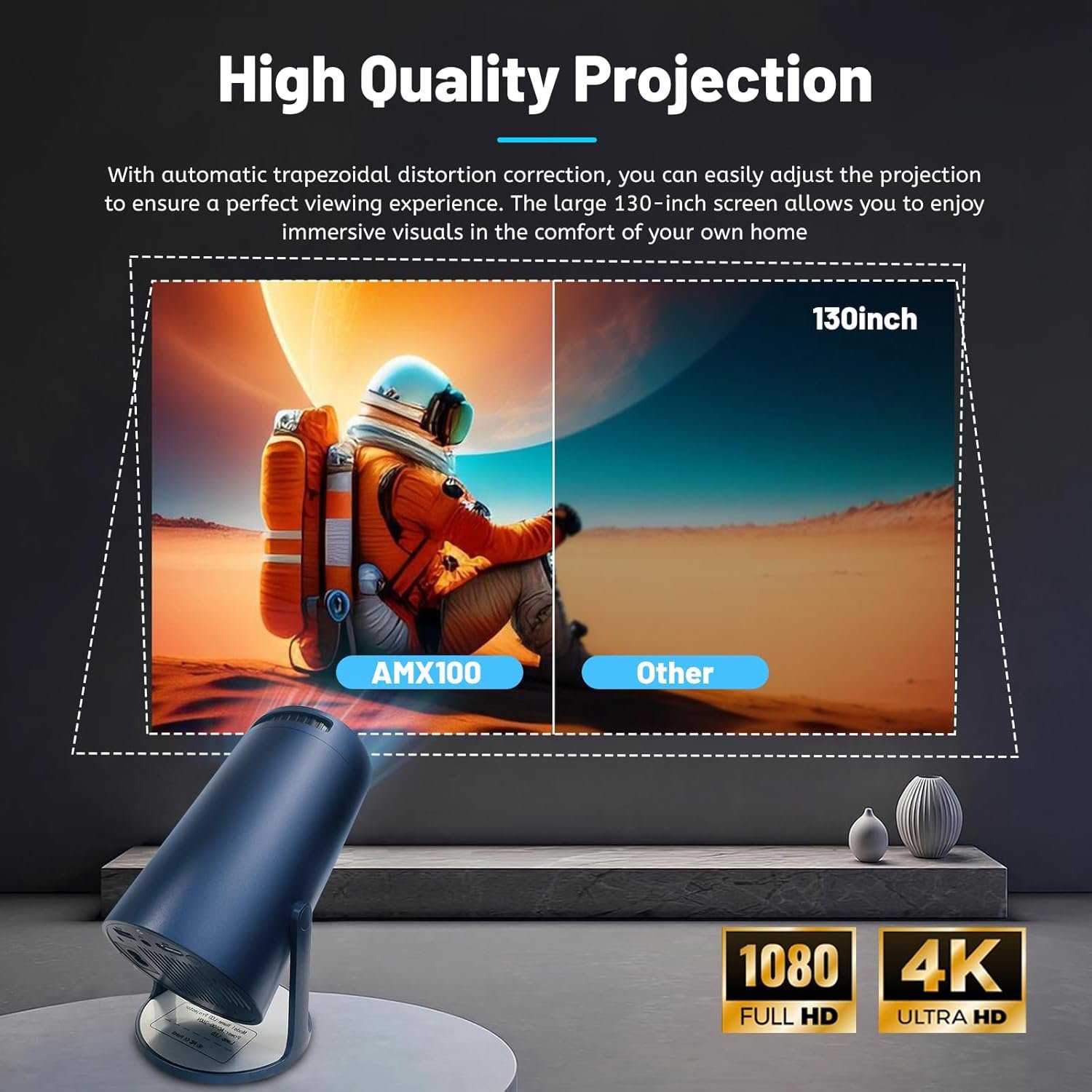 『High-Quality Projection』The HY300 supports 4K/1080P resolution, delivering sharp and clear images. With automatic keystone correction, you can easily adjust the projection to ensure a perfect viewing experience. The 130-inch large screen allows you to enjoy immersive visuals right from the comfort of your own home.