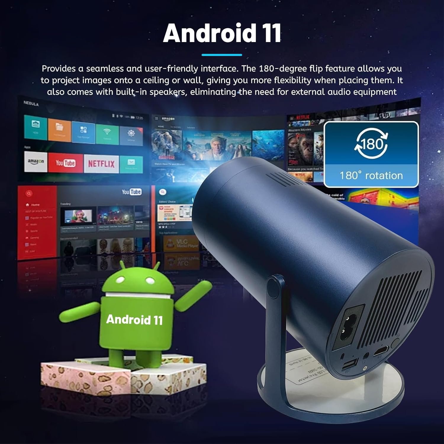 『Advanced Features』With Android 11 operating system, the HY300 offers a seamless and user-friendly interface. The 180-degree flip function allows you to project images onto the ceiling or wall, giving you more flexibility in placement. It also comes with built-in speakers, eliminating the need for external audio devices.